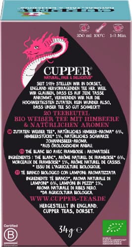 ZutatenWeißer Tee*, natürliches Himbeer-Aroma* 6%, Himbeerstücke* 1%, natürliches schwarze Johannisbeer-Aroma. *Aus ökologischem Anbau.