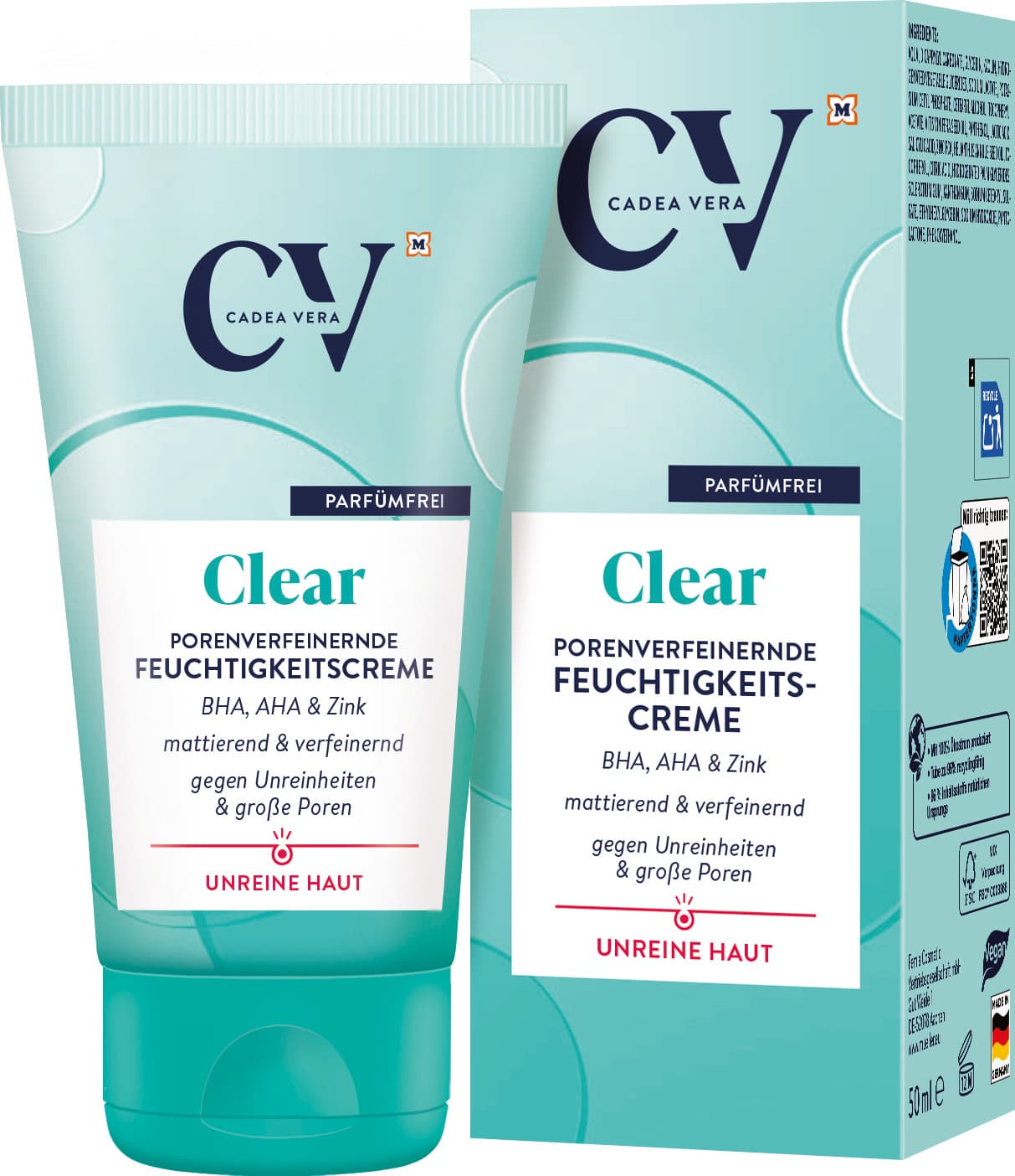 Die CV CLEAR porenverfeinernde Feuchtigkeitscrememit BHA, AHA und Zink spendet sofort intensive, erfrischendeFeuchtigkeit*, bekämpft Unreinheiten, mattiert und verfeinertden Teint.Wirkstoff-PowerBHA (Salicylsäure): ö_x001f_net verstopfte Poren und hilft, Pickel undUnreinheiten schnell und wirksam zu bekämpfen.AHA (Fruchtsäure): hilft dabei Pickelmale optisch zu mildern. DasHautbild zeigt sich perfektionierter mit verfeinerten Poren.Zink: wirkt pickelverursachenden Bakterien entgegen.Milchsäure: löst die abgestorbenen Hautschüppchen, befreit diePoren und sorgt dafür, dass die Haut Feuchtigkeit besser speichernkann.Tonerde: mattiert die Haut.Glycerin und Panthenol: hydratisieren und erfrischen.*in-vivo Studie zur Hautfeuchtigkeit.