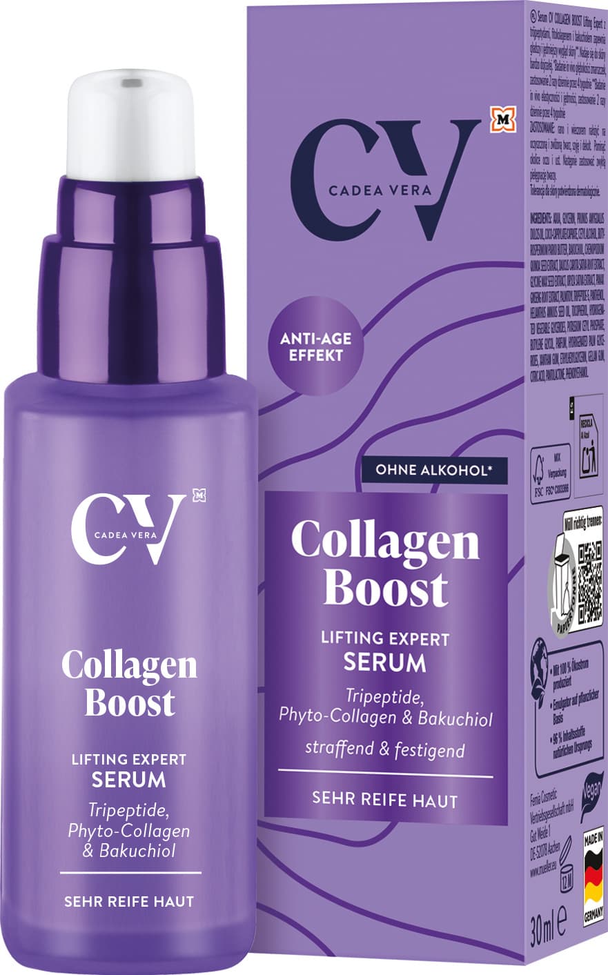 Das CV COLLAGEN BOOST Lifting Expert Serum mit Tripeptiden, Phyto-Collagen und Bakuchiol wirkt nachweislich den sichtbaren Anzeichen der Hautalterung entgegen. Täglich angewendet, werden feine Linien und Falten nachweislich gemildert** und die Hautelastizität verbessert***. Verleiht ein perfektioniertes und strafferes Hautbild und eine verjüngte Ausstrahlung.