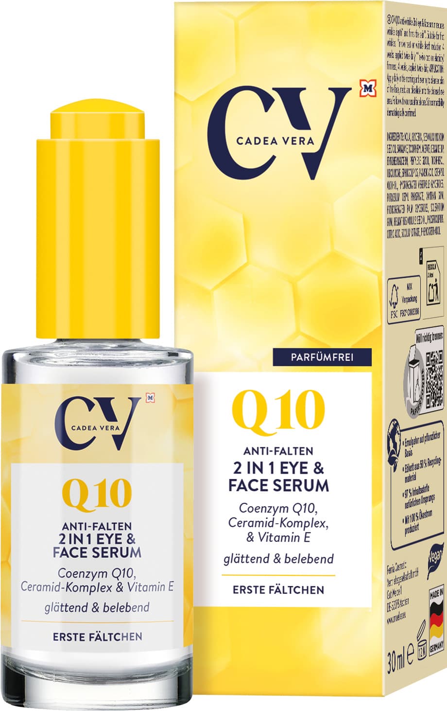 Das CV Q10 Anti-Falten 2in1 Eye& Face Serum versorgt die Augenpartie und die Haut, dank seiner Anti-Aging-Formel mit Coenzym Q10, Ceramid-Komplex und Vitamin E, intensiv mit Feuchtigkeit und bekämpft wirkungsvoll erste Altersanzeichen. Bei regelmäßiger Anwendung werden die Faltentiefe und erste Fältchen nachweisbar gemildert* sowie die Hautelastizität gesteigert**.