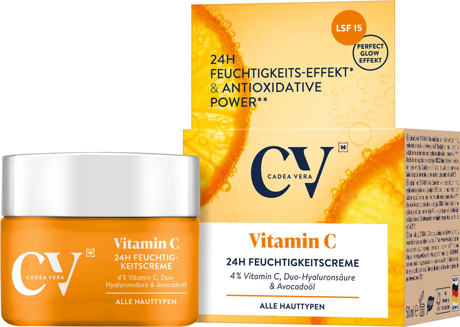 Die CV VITAMIN C 24h Feuchtigkeitscreme mit Antioxidativer-Power-Formel**, Vitamin C, Duo-Hyaluronsäure und Avocadoöl versorgt die Haut mit intensiver Feuchtigkeit* und kann bei täglicher Anwendung helfen Falten und Pigmentflecken vorzubeugen**/***. Für langanhaltendhydratisierte, geschmeidige Haut und sofort frische Ausstrahlung. Ebenmäßiger Teint durch Schutz voräußeren Umwelteinflüssen** und durch Milderung von Pigmentflecken***.