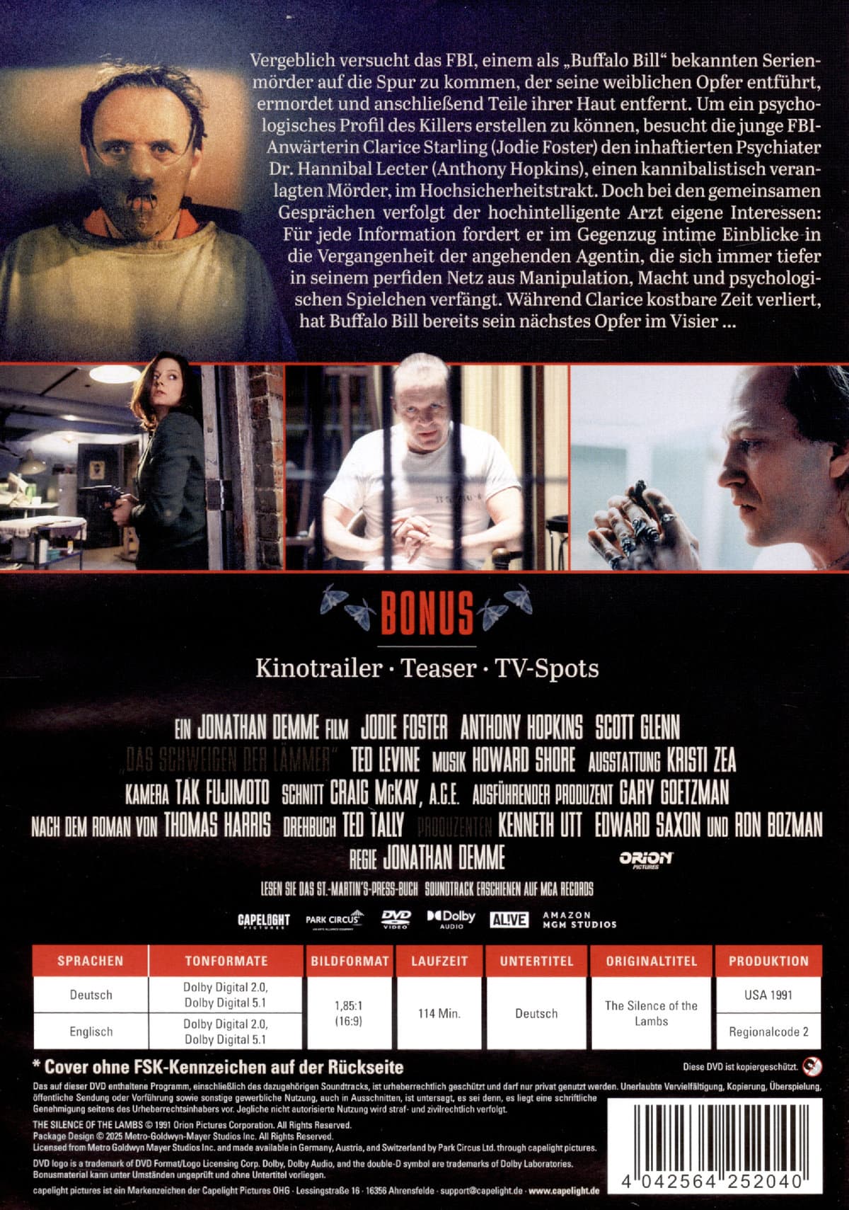 | Schauspieler | Jodie Foster, Anthony Hopkins, Scott Glenn, Ted Levine, Anthony Heald, Charles Napier, Diane Baker, Kasi Lemmons, Brooke Smith, Lawrence A. Bonney, Lawrence T. Wrentz |