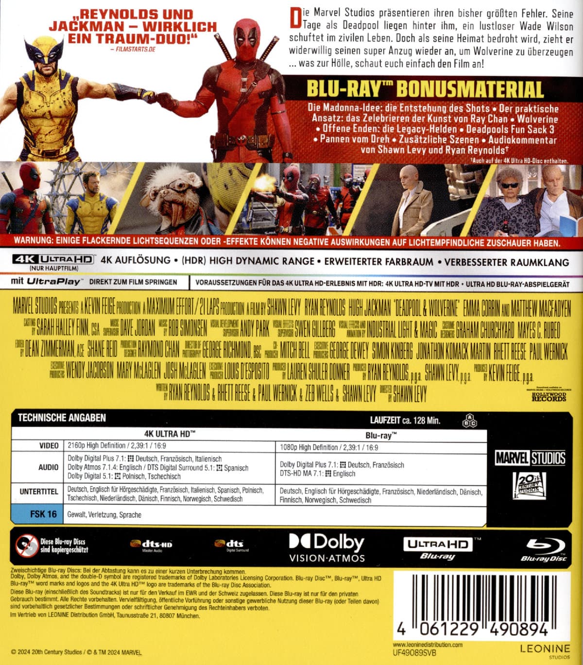 | Zusatzinfos / Bonusmaterial beim Film dabei | Audiokommentar mit Shawn Levy und Ryan Reynolds, Die Madonna-Idee: die Entstehung des Shots / Der praktische Ansatz: das Zelebrieren der Kunst von Ray Chan / Offene Enden: die Legacy-Helden / Wolverine / Deadpools Fun Sack 3 / Pannen vom Dreh / Zusätzliche Szenen / Audiokommentar |