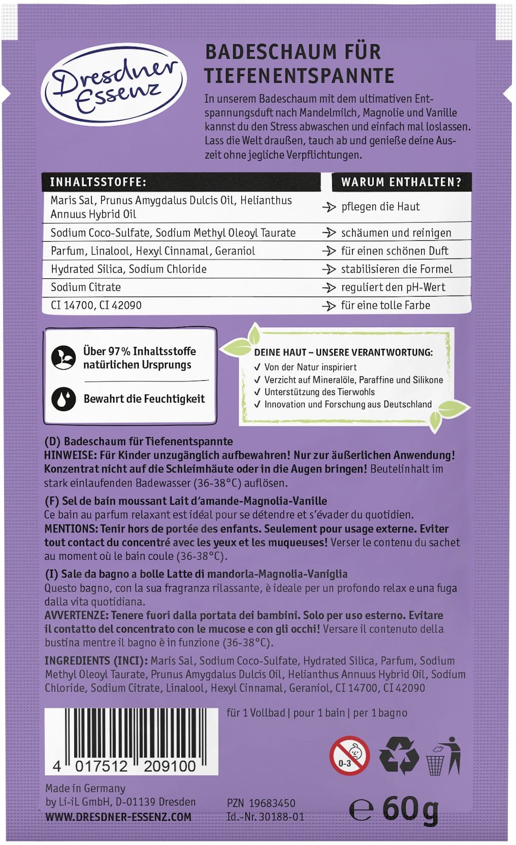 Dieser Badeschaum verwandelt das Badewasser in einen cremigen Schaum und reinigt die Haut sanft. Die Formulierung mit Mandel- und Sonnenblumenöl verleiht ein angenehmes Hautgefühl. Für die Anwendung wird der Beutelinhalt einfach im einlaufenden, 36 bis 38 Grad warmen Badewasser aufgelöst.