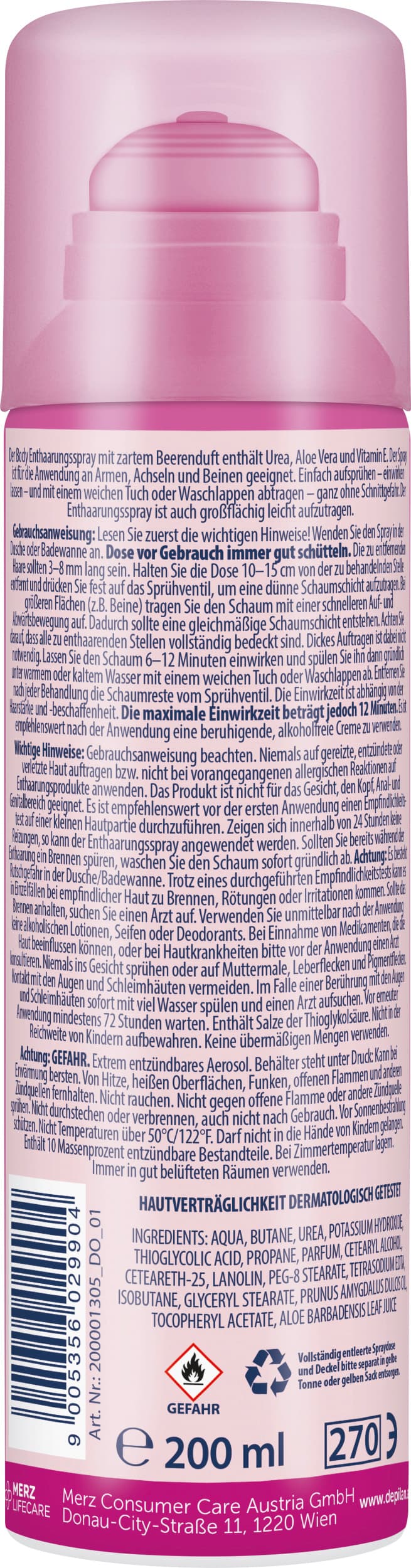 Wichtige Hinweise: Gebrauchsanweisung beachten. Niemals auf gereizte, entzündete oder verletzte Haut auftragen bzw. nicht bei vorangegangenen allergischen Reaktionen auf Enthaarungsprodukte anwenden. Das Produkt ist nicht für das Gesicht, den Kopf, Anal- und Genitalbereich geeignet. Es ist empfehlenswert vor der ersten Anwendung einen Emp?ndlichkeitstest auf einer kleinen Hautpartie durchzuführen. Zeigen sich innerhalb von 24 Stunden keine Reizungen, so kann der Enthaarungsspray angewendet werden. Sollten Sie bereits während der Enthaarung ein Brennen spüren, waschen Sie den Schaum sofort gründlich ab. Achtung: Es besteht Rutschgefahr in der Dusche/ Badewanne. Trotz eines durchgeführten Empfindlichkeitstests kann es in Einzelfällen bei empfindlicher Haut zu Brennen, Rötungen oder Irritationen kommen. Sollte das Brennen anhalten, suchen Sie einen Arzt auf. Verwenden Sie unmittelbar nach der Anwendung keine alkoholischen Lotionen, Seifen oder Deodorants. Bei Einnahme von Medikamenten, die die Haut beein?ussen können, oder bei Hautkrankheiten bitte vor der Anwendung einen Arzt konsultieren. Niemals ins Gesicht sprühen oder auf Muttermale, Leberflecken und Pigmenflecken. Kontakt mit den Augen und Schleimhäuten vermeiden. Im Falle einer Berührung mit den Augen und Schleimhäuten sofort mit viel Wasser spülen und einen Arzt aufsuchen. Vor erneuter Anwendung mindestens 72 Stunden warten. Enthält Salze der Thioglykolsäure. Nicht in der Reichweite von Kindern aufbewahren. Keine übermäßigen Mengen verwenden. GEFAHR. Extrem entzündbares Aerosol. Behälter steht unter Druck: Kann bei Erwärmung bersten. Von Hitze, heißen Oberflächen, Funken, offenen Flammen und anderen Zündquellen fernhalten. Nicht rauchen. Nicht gegen offene Flamme oder andere Zündquelle sprühen. Nicht durchstechen oder verbrennen, auch nicht nach Gebrauch. Vor Sonnenbestrahlung schützen. Nicht Temperaturen über 50°C/122°F aussetzen. Darf nicht in die Hände von Kindern gelangen. Enthält 10 Massenprozent entzündbare Bestandteile. Bei Zimmertemperatur lagern. Immer in gut belüfteten Räumen verwenden.