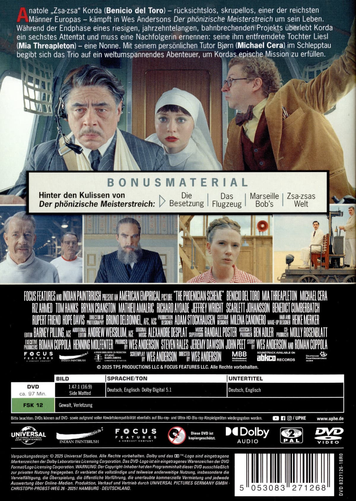 | Zusatzinfos / Bonusmaterial beim Film dabei | Hinter den Kulissen von "Der phönizische Meisterstreich": Die Besetzung,Das Flugzeug,Marseille Bob's,Zsa.-zsas Welt |