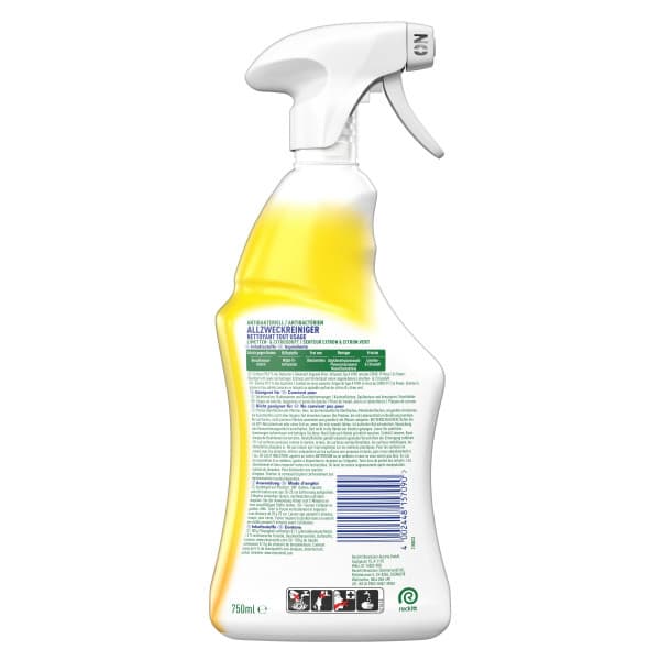 | Inhaltsstoffe | <5% nichtionische Tenside, Desinfektionsmittel, Duftstoffe, Limonen. 100 g Flüssigkeit enthalten 0,11g Benzalkoniumchlorid. |