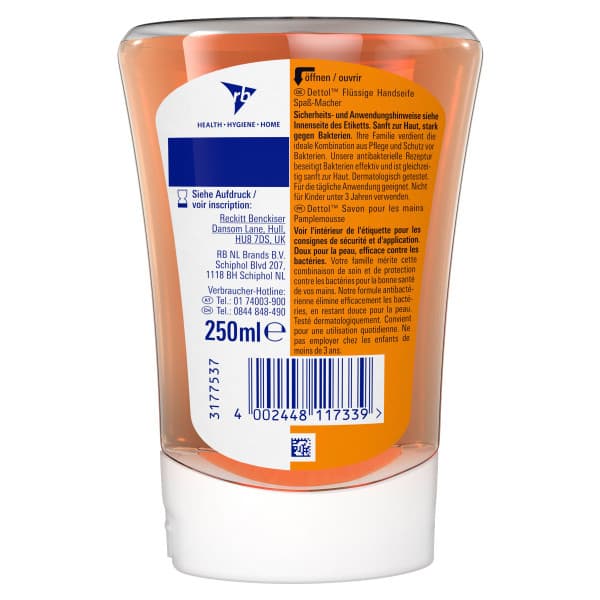 Dettol Flüssige Seife No-Touch Nachfüller Grapefruit - 1 x 250 ml Handseife für den automatischen Seifenspender Sanft zur Haut, stark gegen Bakterien: Die antibakterielle Formel der Dettol Flüssigseifen sorgt für ein hygienisch sauberes Handgefühl und bietet eine ideale Kombination aus Pflege und täglichem Schutz. Für sorglos saubere Hände: Die No-Touch Seifen von Dettol sind dermatologisch getestet und sorgen für ein geschmeidiges Hautgefühl. Das ideale Dufterlebnis: Die Flüssigseife verzaubert durch einen sanften Duft nach Grapefruit und lässt sich problemlos mit jedem No-Touch Seifenspender von Dettol kombinieren. Beschützt seit über 80 Jahren: Dettol ist seit über 80 Jahren der Experte für hygienische Sauberkeit und den Schutz Ihrer Familie, jeden Tag.