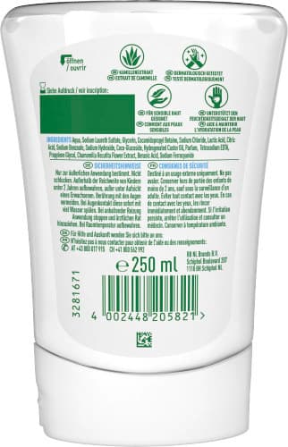 | Anwendungshinweis | Nur mit Dettol No-Touch Seifenspender verwenden. Spender ausschalten. Nachfüller in den Spender drücken, bis er einrastet. Spender einschalten. Angefeuchtete Hände unter Spenderöffnung halten – Seife wird automatisch dosiert. Hände für mindestens 30 Sekunden gründlich einseifen, einschliesslich Nägel und Daumen. Anschliessend Hände abspülen und trocknen. |