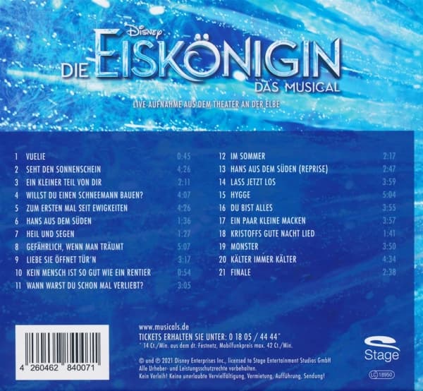 | 21 | Weckerlin, Sabrina / Pieper, Celena / Monteiro, Benet / Avastia, Elindo / Waardenburg, Milan van / Minsk, Eric | Finale (live from Theater an der Elbe) (Musical Soundtrack "Die Eiskönigin") (german) | 00:02:35 |