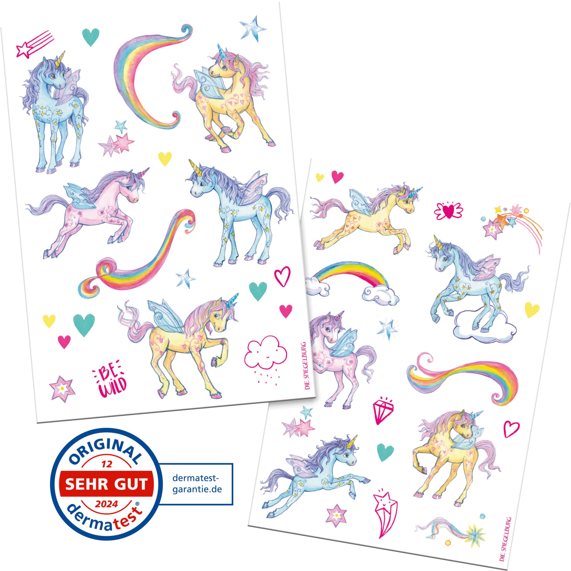 Magischer Körperschmuck! Die Tattoos - Einhorn-Paradies von Die Spiegelburg zaubern niedliche Einhorn-Motive auf die Haut. Die hautfreundlichen Tattoos lassen sich leicht auftragen und mit Seife entfernen. Eine tolle Idee für Kinderpartys, die Schultüte oder den Nikolausstiefel.