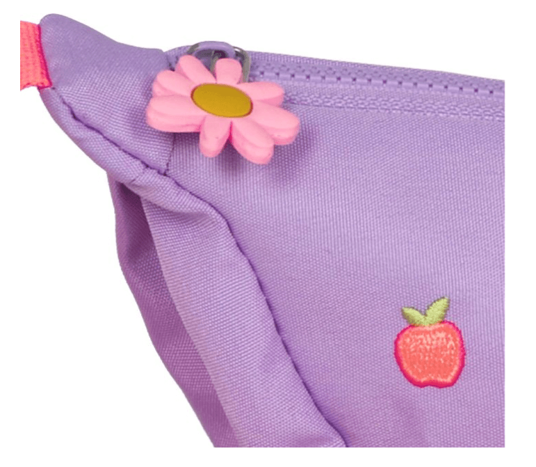 Der verstellbare Schulterriemen sorgt für ein angenehmes Tragegefühl, egal ob quer über den Körper oder lässig über der Schulter getragen. Die süße Blütenapplikation am Zipper rundet den fruchtigen Look harmonisch ab und macht die Tasche zu einem echten Hingucker.