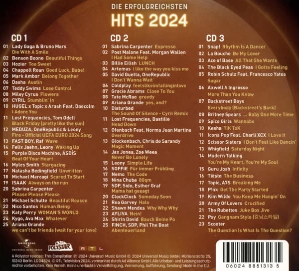 Diese CD bietet eine musikalische Reise durch das Jahr und vereint die Lieder, die in den vergangenen Monaten für Begeisterung gesorgt haben. Die Auswahl umfasst eine Vielzahl von Genres und Stimmungen, von emotionalen Balladen bis hin zu tanzbaren Club-Tracks. Mit dabei sind unter anderem Benson Boone, Hozier, Shirin David, Lost Frequencies und Sabrina Carpenter, die mit ihren Songs die Playlisten geprägt haben.
