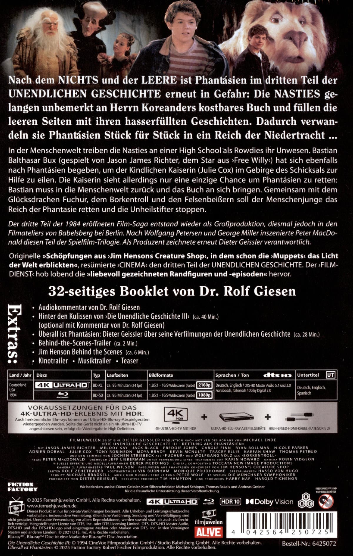 | Zusatzinfos / Bonusmaterial beim Film dabei | Umfangreiches Booklet; Audiokommentar von Dr. Rolf Giesen; Hinter den Kulissen von Die unendliche Geschichte III; kommentiert von Dr. Rolf Giesen (ca. 38 Min.); Phantásien ist überall: Dieter Geissler über seine Verfilmungen der Unendlichen Geschichte (ca. 25 Min.); Behind-the-Scenes-Trailer; Kinotrailer; Musik-Trailer; Teaser |