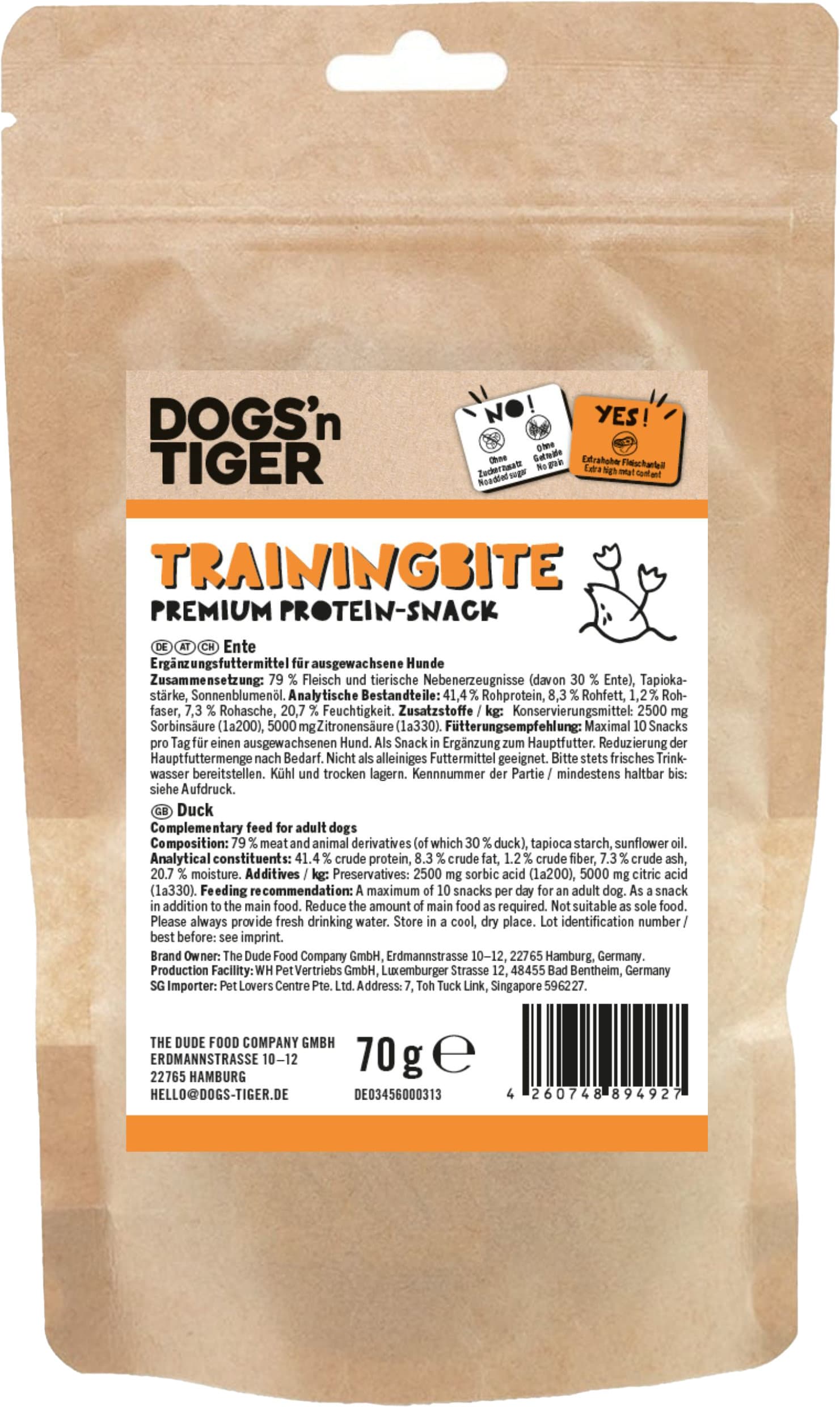 Unsere Training Bites Ente sind der perfekte Begleiter für jedes Training und jede Belohnung zwischendurch. Mit 79% hochwertigem Entenfleisch liefern sie wertvolle Proteine für starke Muskeln und gesunde Energie – natürlich ohne Getreide und ohne Zuckerzusatz. Die kleinen, weichen Snacks sind leicht zu portionieren und passen perfekt in jede Tasche. Sie sind besonders bekömmlich und sorgen mit ihrem natürlichen Geschmack für Begeisterung bei jeder Fellnase – auch bei sensiblen Hunden. Durch die schonende Herstellung bleiben die wertvollen Nährstoffe des Entenfleischs erhalten, sodass dein Hund eine ehrliche Belohnung bekommt, die sowohl schmeckt als auch nährstoffreich ist. Mit Dogs’n Tiger entscheidest du dich für clevere Trainingssnacks, die Freude und Funktionalität verbinden – für motivierte Hunde und ein gutes Gefühl bei jeder Belohnung.