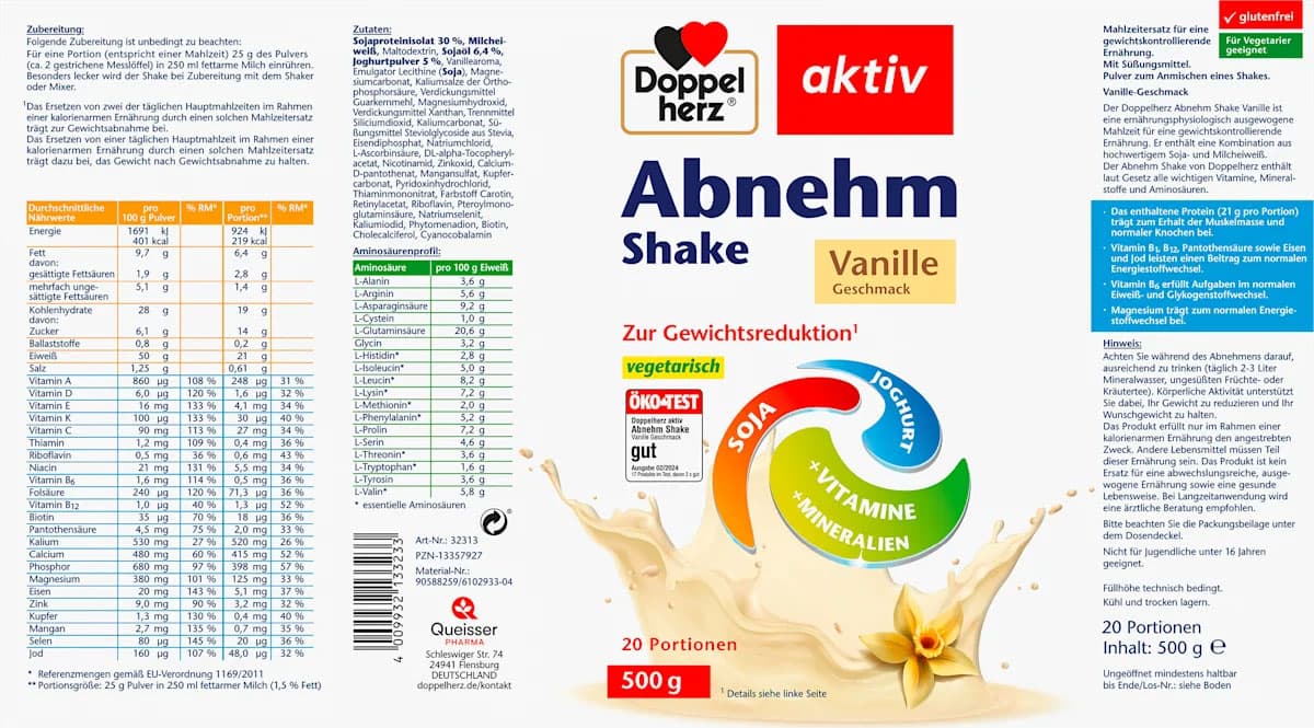 Nahrungsergänzungsmittel: Der Vanille Diät Shake von Doppelherz ist eine ernährungsphysiologisch entwickelte Mahlzeit, die ideal für eine gewichtskontrollierende Ernährung geeignet ist. Er enthält eine sorgfältigen Kombination aus Soja- und Milcheiweiß. Das enthaltene Protein (21 g pro Portion) trägt zum Erhalt der Muskelmasse bei. Der unglaublich leckere Vanille-Geschmack macht das Trinken zu einem Genuss und verwandelt jede Mahlzeit in ein schmackhaftes Erlebnis. Ob als schnelle Mahlzeit oder als Ergänzung zum täglichen Speiseplan – der Vanille Diät Shake ist eine praktische und köstliche Wahl für alle, die auf ihre Ernährung achten möchten.