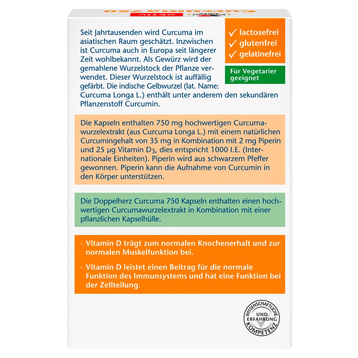| Inhaltsstoffe | Curcuminhaltiges Curcumawurzelpulver, Überzugsmittel Hydroxypropylmethylcellulose, Trennmittel Magnesiumsalze der Speisefettsäuren, Piperin, Cholecalciferol |
