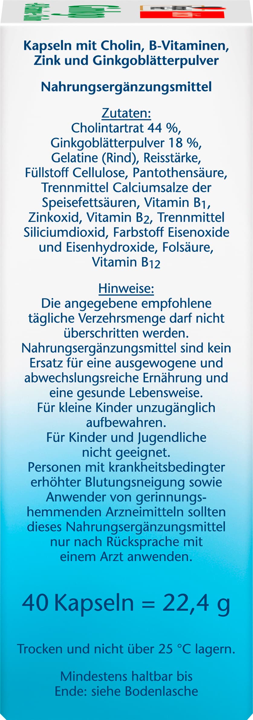 Zutaten Cholintartrat 44 %, Ginkgoblätterpulver 18 %, Gelatine (Rind), Reisstärke, Füllstoff Cellulose, Pantothensäure, Trennmittel Calciumsalze der Speisefettsäuren, Vitamin B1, Zinkoxid, Vitamin B2, Trennmittel Siliciumdioxid, Farbstoff Eisenoxide und Eisenhydroxide, Folsäure, Vitamin 812