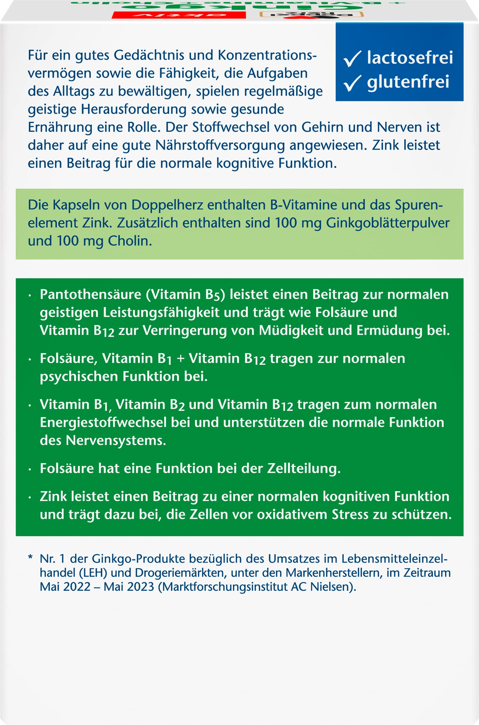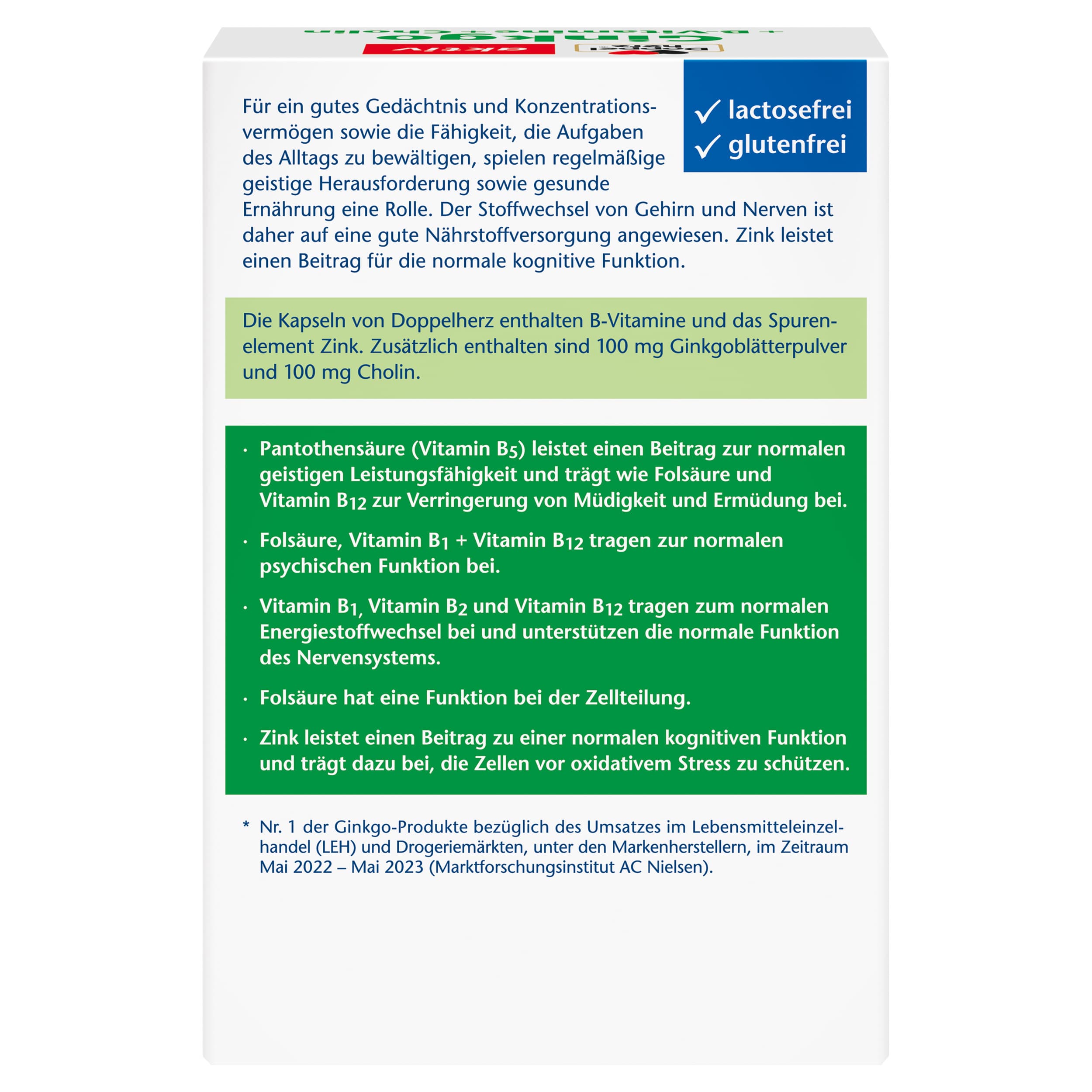 Für ein gutes Gedächtnis und Konzentrationsvermögen sowie die Fähigkeit, die Aufgaben des Alltags zu bewältigen, spielen regemäßige geistige Herausforderungen sowie gesunde Ernährung eine Rolle. Der Stoffwechsel von Gehirn und Nerven ist daher auf eine gute Nährstoffversorgung angewiesen. Zink leistet einen Beitrag für die normale kognitive Funktion. Die Kapseln von Doppelherz enthalten B-Vitamine und das Spurenelement Zink. Zusätzlich enthalten sind 100 mg Ginkgoblätterpulver und 100 mg Cholin.