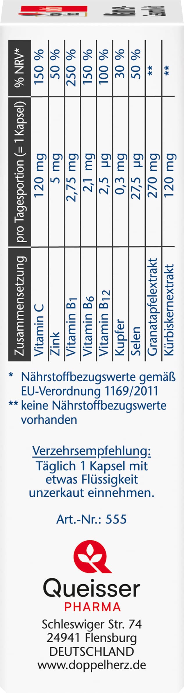 Zutaten Granatapfelextrakt, Füllstoff Dicalciumphosphat, L-Ascorbinsäure, Kürbiskernextrakt, Gelatine (Rind), Maltodextrin, Zinkgluconat, Trennmittel Magnesiumsalze der Speisefettsäuren, Trennmittel Siliciumdioxid, Thiaminhydrochlorid, Pyridoxinhydrochlorid, Kupfergluconat, Farbstoff Eisenoxide und Eisenhydroxide, Natriumselenit, Cyanocobalamin
