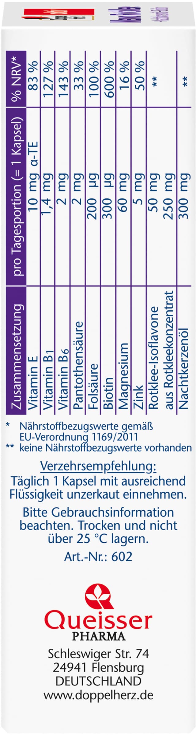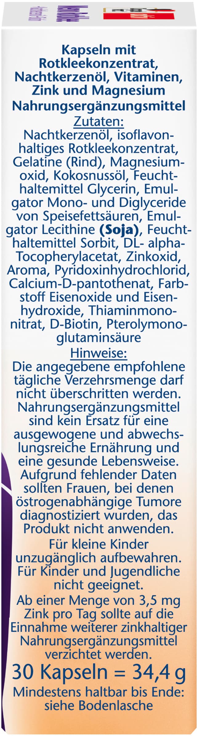 Zutaten Nachtkerzenöl, isoflavonhaltiges Rotkleekonzentrat, Gelatine (Rind), Magnesiumoxid, Kokosnussöl, Feuchthaltemittel Glycerin, Emulgator Mono- und Diglyceride von Speisefettsäuren, Emulgator Lecithine (SOJA), Feuchthaltemittel Sorbit, DL-alpha-Tocopherylacetat, Zinkoxid, Aroma, Pyridoxinhydrochlorid, Calcium-D-pantothenat, Farbstoff Eisenoxide und Eisenhydroxide, Thiaminmononitrat, D-Biotin, Pteroylmonoglutaminsäure