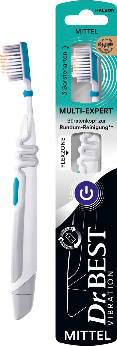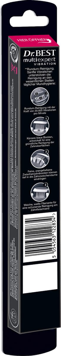 Die Dr.BEST Vibration multi expert Zahnbürste ermöglicht eine gründliche Reinigung mit der Kraft von 20.000 Vibrationen pro Minute. Der multifunktionale Bürstenkopf reinigt dabei 3 wesentliche Stellen der täglichen Zahnpflege: Zahnoberflächen, Zahnzwischenräume und Zahnfleischrand.Blaue Spezialborsten für eine gründliche Reinigung der ZahnoberflächenDie feinen, orangenen Interdentalborsten sind von Zahnseide inspiriertWeiße, weiche Filamente für eine schonende Reinigung des Zahnfleischrands