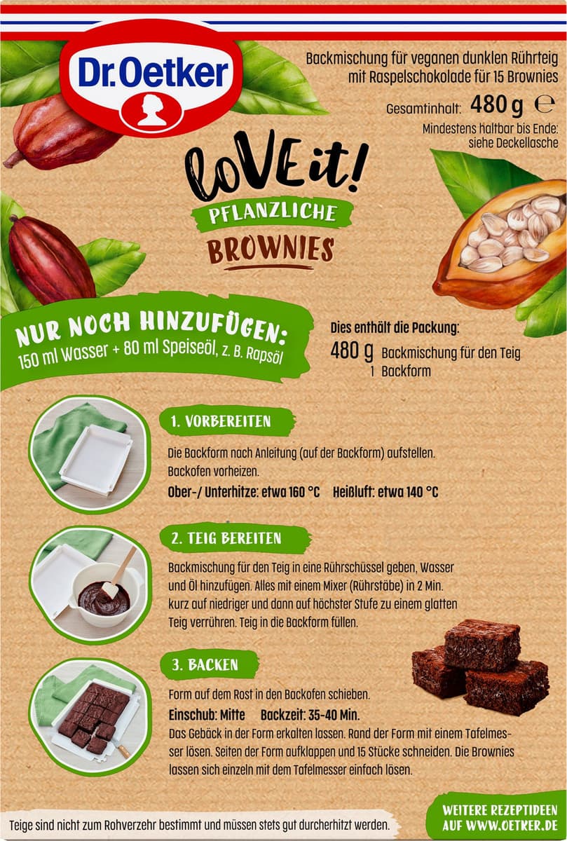Backmischung für veganen dunklen Rührteig mit Raspelschokolade für 15 Brownies
