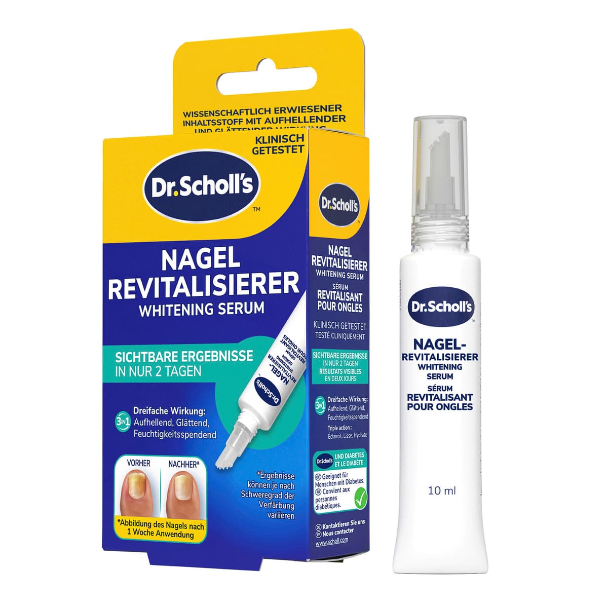 Der Dr. Scholl's Nagel Revitalisierer ist klinisch getestet und enthält einen wissenschaftlich erwiesenen Aufheller, der Ergebnisse mit DREIFACHER WIRKUNG erzielt - er ist AUFHELLEN, GLÄTTEND und FEUCHTIGKEITSSPENDEND!