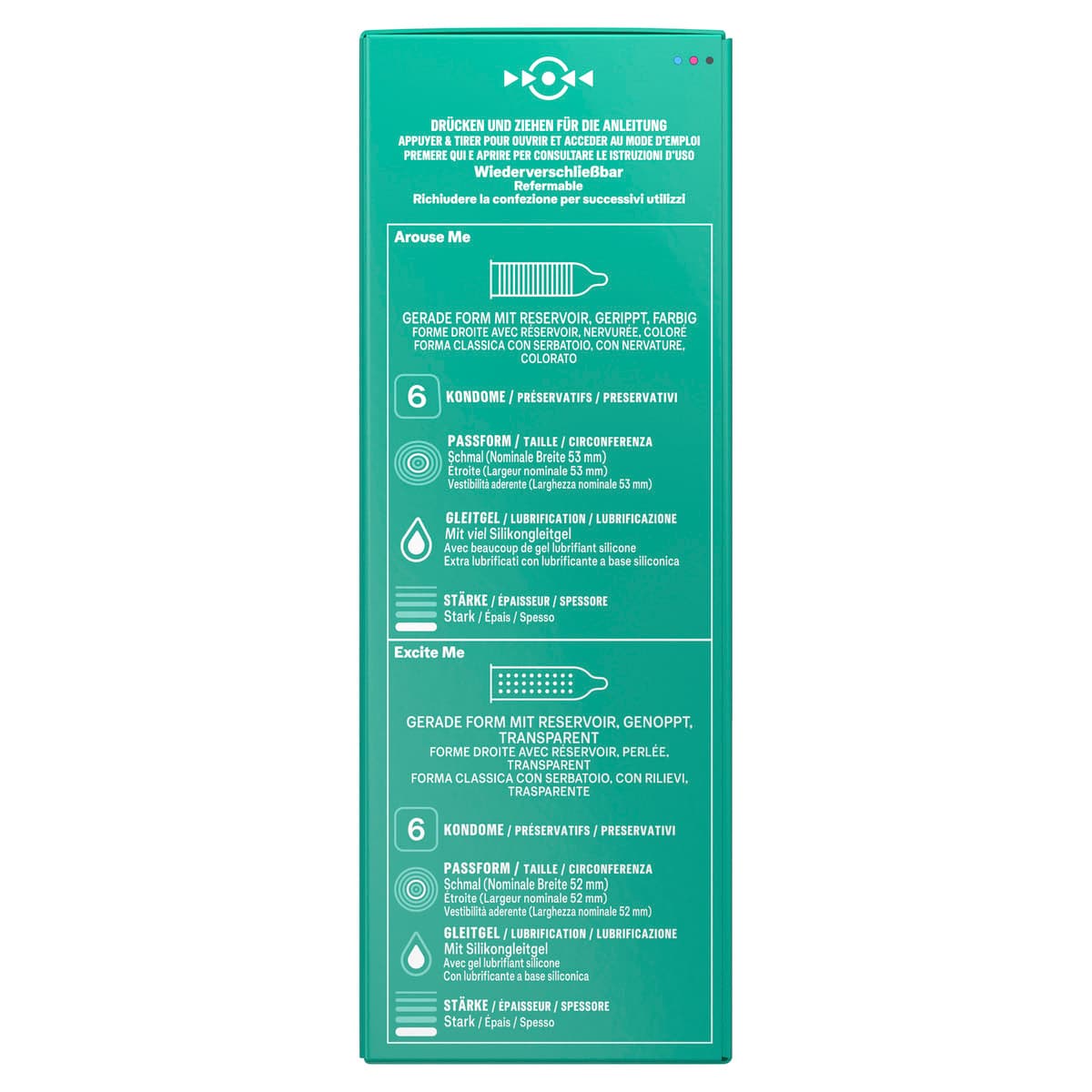 - FÜR UNTERSCHIEDLICHSTE BEDÜRFNISSE: Die Mixpackung enthält dünne Kondome für intensives Empfinden (Gefühlsecht Classic), fruchtige Erdbeer-Kondome (Erdbeere) sowie Kondome mit Rippen (Arouse Me) und Noppen (Excite Me) für extra Stimulation