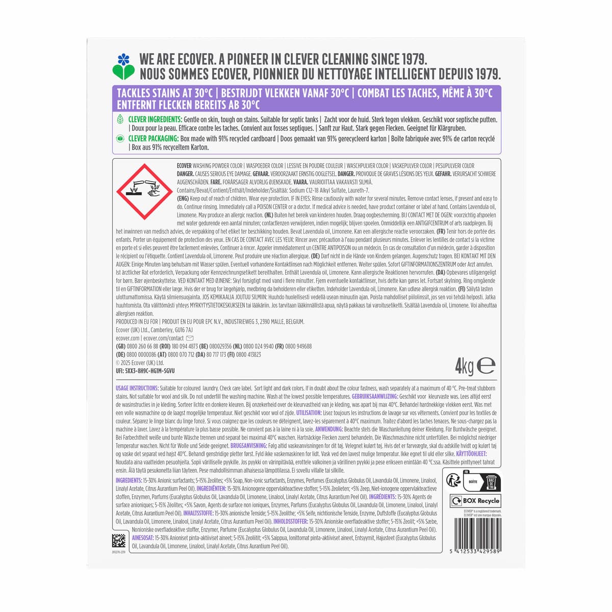 Inhaltsstoffe15-30% anionische Tenside; 5-15% Zeolithe; <5%: Seife, nichtionische Tenside, Enzyme, Duftstoffe (Eucalyptus Globulus Oil, Lavandula Oil, Limonene, Linalool, Linalyl Acetate, Citrus Aurantium Peel Oil).