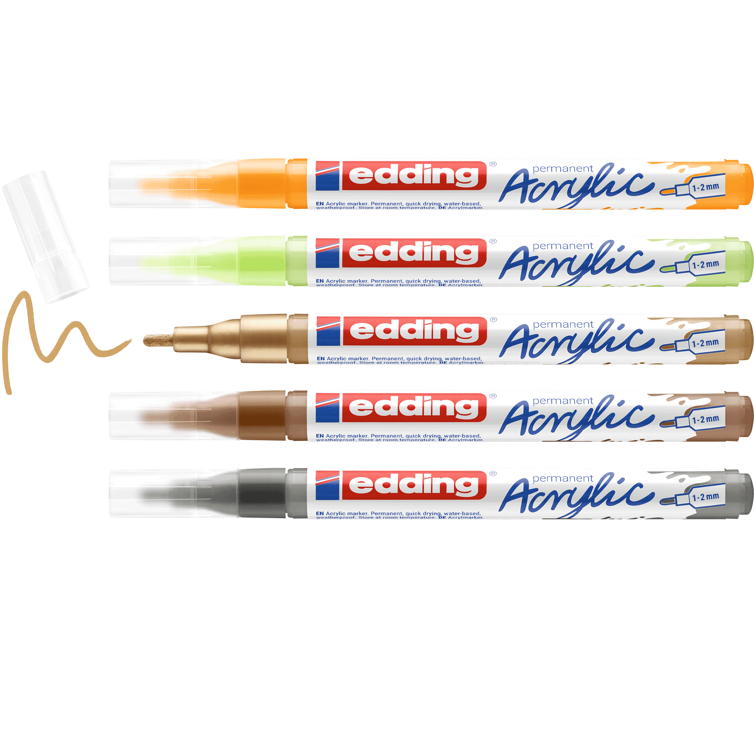 Entdecke das edding 5300 Acrylmarker-Set, das die Flexibilität eines Markers mit der Brillanz von Acrylfarben vereint. Das hochwertige Set, bestehend aus fünf Farben mit einer feinen Spitze, erweckt deine kreativen Ideen auf fast jeder Oberfläche zum Leben. Ob Künstler, Hobby-Maler oder DIY-Liebhaber – diese Marker sind für jeden geeignet, der Wert auf Präzision und Qualität legt. Dank der wasserfesten, pigmentierten Tinte auf Wasserbasis gestaltest du Kunstwerke, die Wind und Wetter trotzen. Egal ob auf Leinwand, Papier, Holz, Stein oder Terrakotta – die Farben bleiben leuchtend, lichtecht und sind mit einem tollen Finish versehen. Die robuste, feine Spitze ermöglicht es dir, feine Linien und Details mit Leichtigkeit zu zeichnen. Zusätzlich sorgt das innovative Ventilsystem für einen kontinuierlichen Tintenfluss. Das Set beinhaltet die Farben Anthrazit, Reichgold, Haselnussbraun, Pastellgrün und Sonnengelb. Tipp: Bewahre die Stifte horizontal bei Raumtemperatur auf, um eine optimale Leistung zu gewährleisten. Mit Sitz in Deutschland steht edding für Qualität und Innovation. Mach den ersten Schritt zu beeindruckenden Kunstwerken mit dem edding 5300 Acrylmarker-Set.