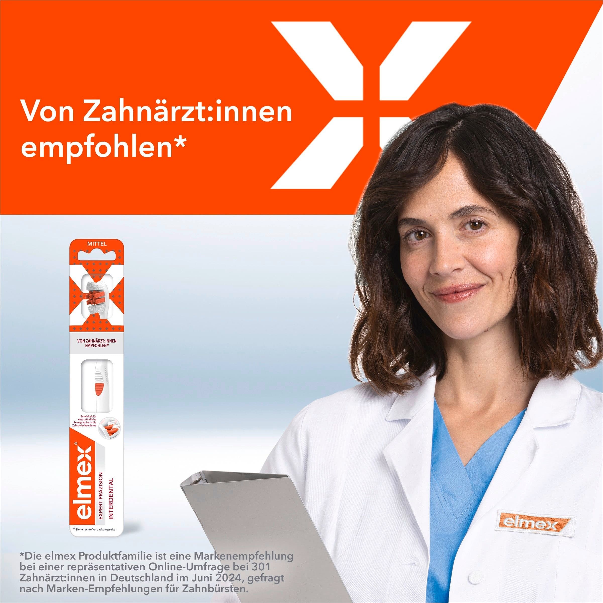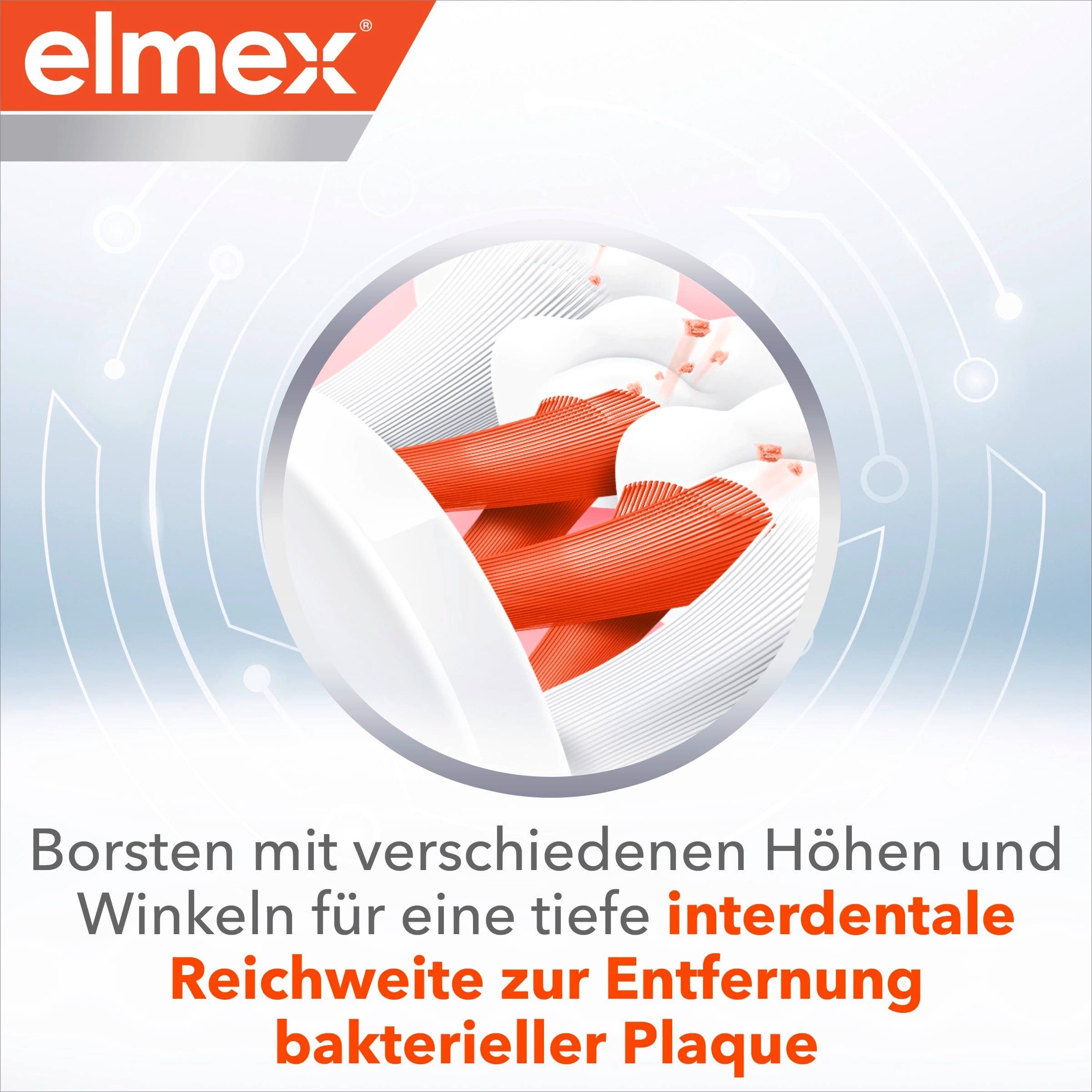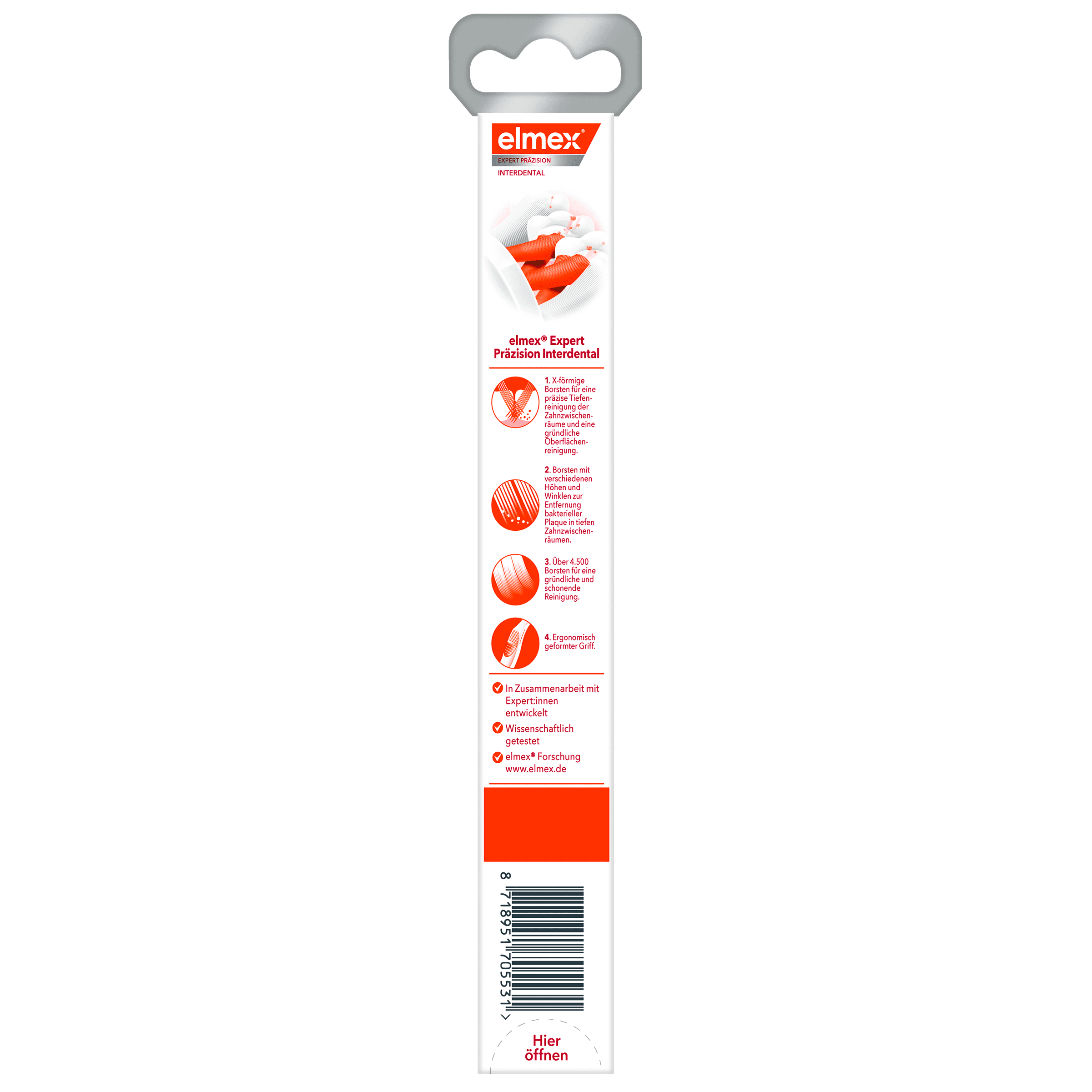 Die elmex Expert Präzision Interdental Zahnbürste sorgt für eine gründliche Interdentalreinigung. Diese Zahnbürste wurde mit Xförmigen Filamenten entwickelt, für eine präzise Tiefenreinigung der Zahnzwischenräume und eine gründliche Oberflächenreinigung. Außerdem verfügt die Interdentalzahnbürste über Filamente mit verschiedenen Höhen und Winkeln zur besseren Entfernung bakterieller Plaque in tiefen Zahnzwischenräumen. Zusätzlich sorgen über 4.500 dicht nebenainander angeordnete Filamente für eine gründliche und schonende Reinigung. Mit einem ergonomisch geformten Griff für eine komfortable Anwendung. Diese Zahnbürste wurde wissenschaftlich getestet und in Zusammenarbeit mit Zahnexpert:innen entwickelt. Es wird empfohlen, diese Zahnbürste in Kombination mit der elmex® KARIESSCHUTZ PROFESSIONAL Zahnpasta und einer Zahnspülung zu verwenden.