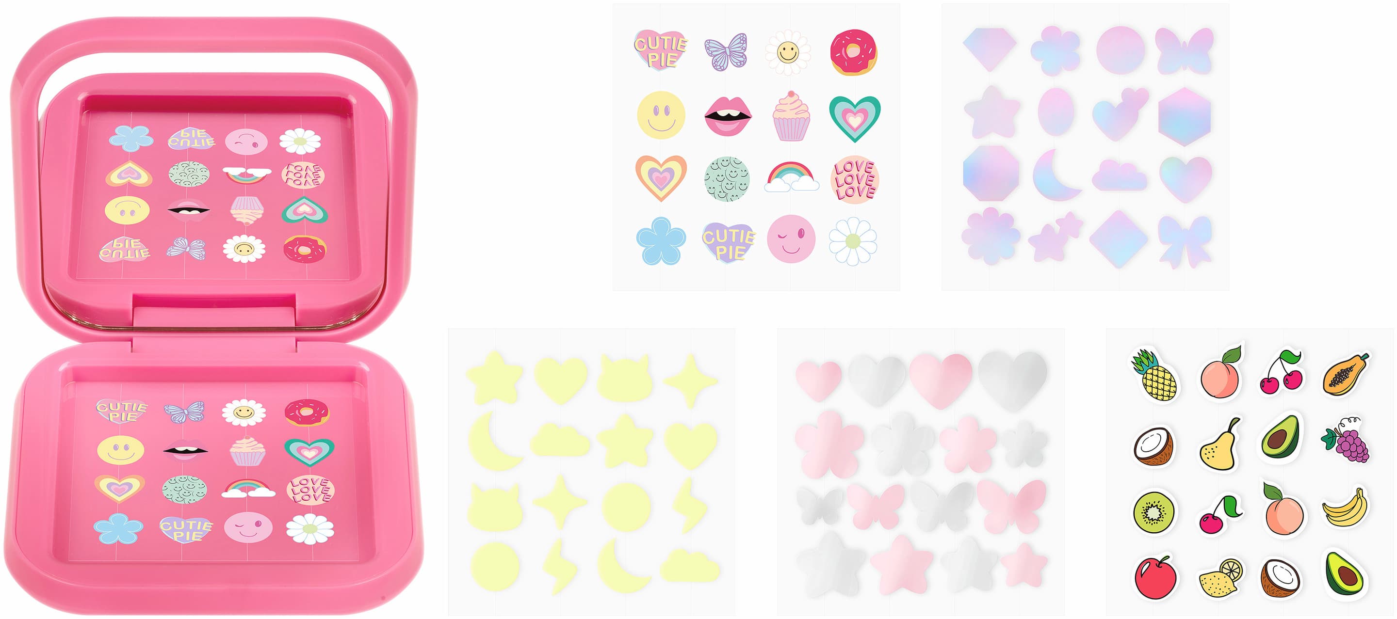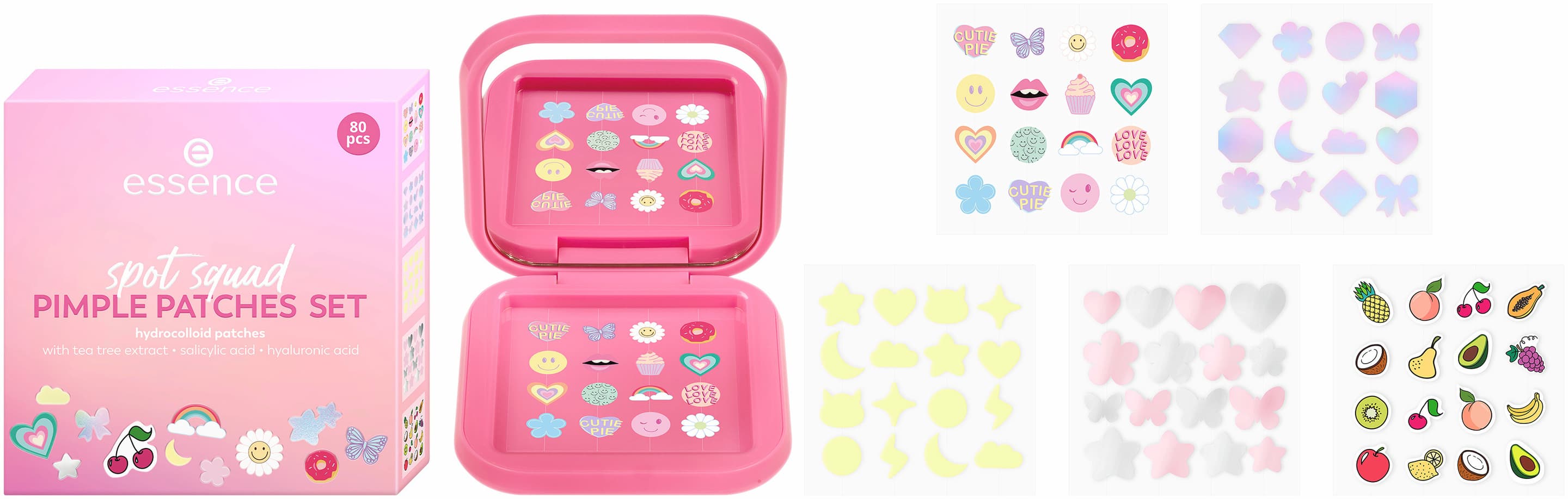 Bringe verspieltes Funkeln in deine Spot-Care-Routine mit dem essence spot squad PIMPLE PATCHES SET 01 Patch Me If You Can. Diese fröhliche Kollektion enthält fünf Bögen mit Patches in ausgefallenen Formen und mit trendigen Effekten – von Glow in the dark über metallisches bis hin zu holografischem Finish. Entwickelt, um ein frischer wirkendes Hautbild zu unterstützen, nehmen die Pickel-Patches Unreinheiten auf und schützen die betroffenen Stellen vor Schmutz oder Kratzen. Verstaut in einem rosafarbenen Kompaktetui mit praktischem Spiegel, sind sie perfekt für spontane Touch-ups, wo immer du bist. Wechsle deinen Look, kombiniere deine Finish-Favoriten und mache diese verspielten Sticker zu einem Teil deiner Pflege-Routine.