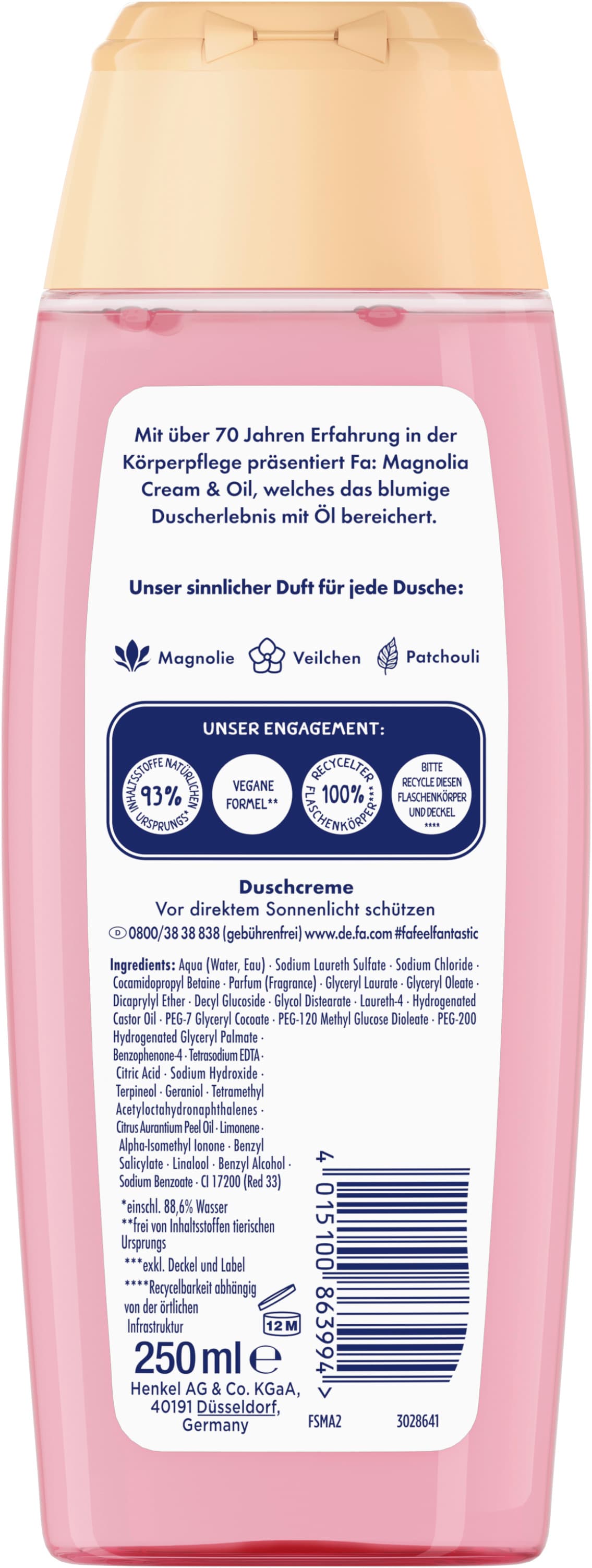 Tauche ein in die Welt von Fa! Schicke deine Sinne auf eine wunderbare Reise mit Fa und genieße die milde Formel des Duschgels mit natürlichem Kokosnuss-Extrakt und den exotisch-pflegenden Duft von Kokosnussmilch. Der Flaschenkörper besteht zu 25% aus recyceltem Material (exkl. Kappe) und die Formel enthält 94% Inhaltsstoffe natürlichen Ursprungs. Eine kleine Menge des Duschgels auf der nassen Haut oder einem Schwamm verteilen, aufschäumen und gründlich abwaschen.