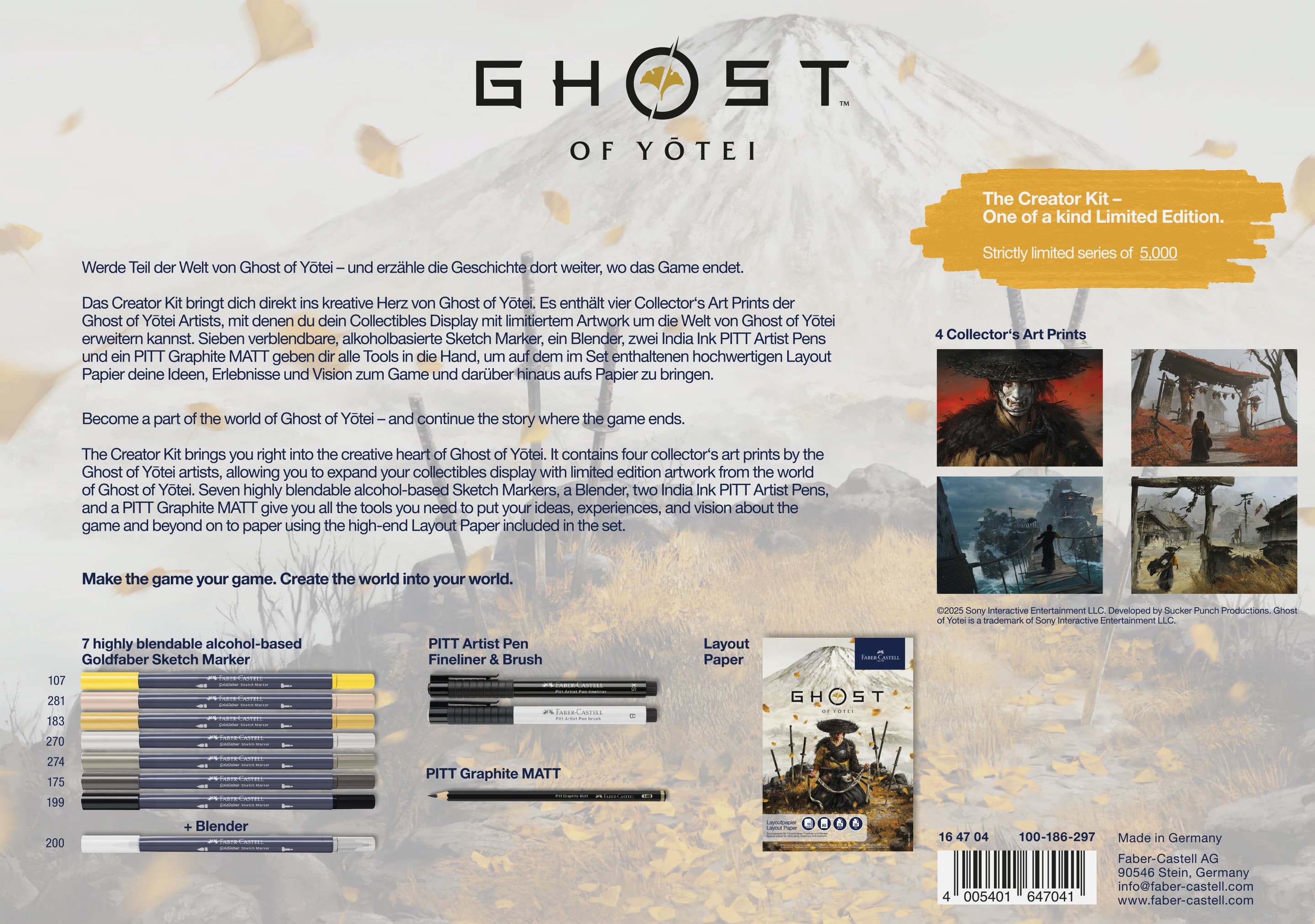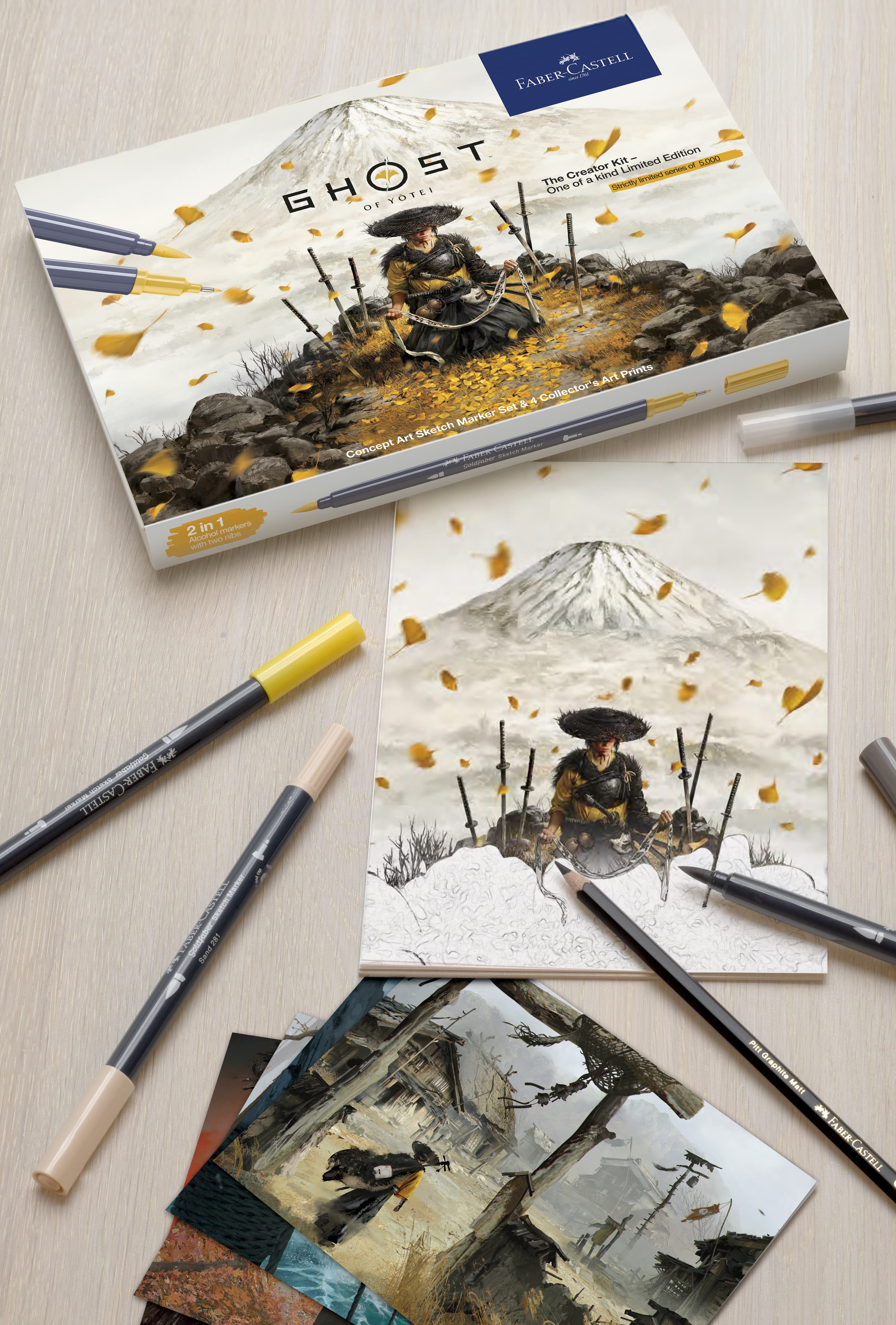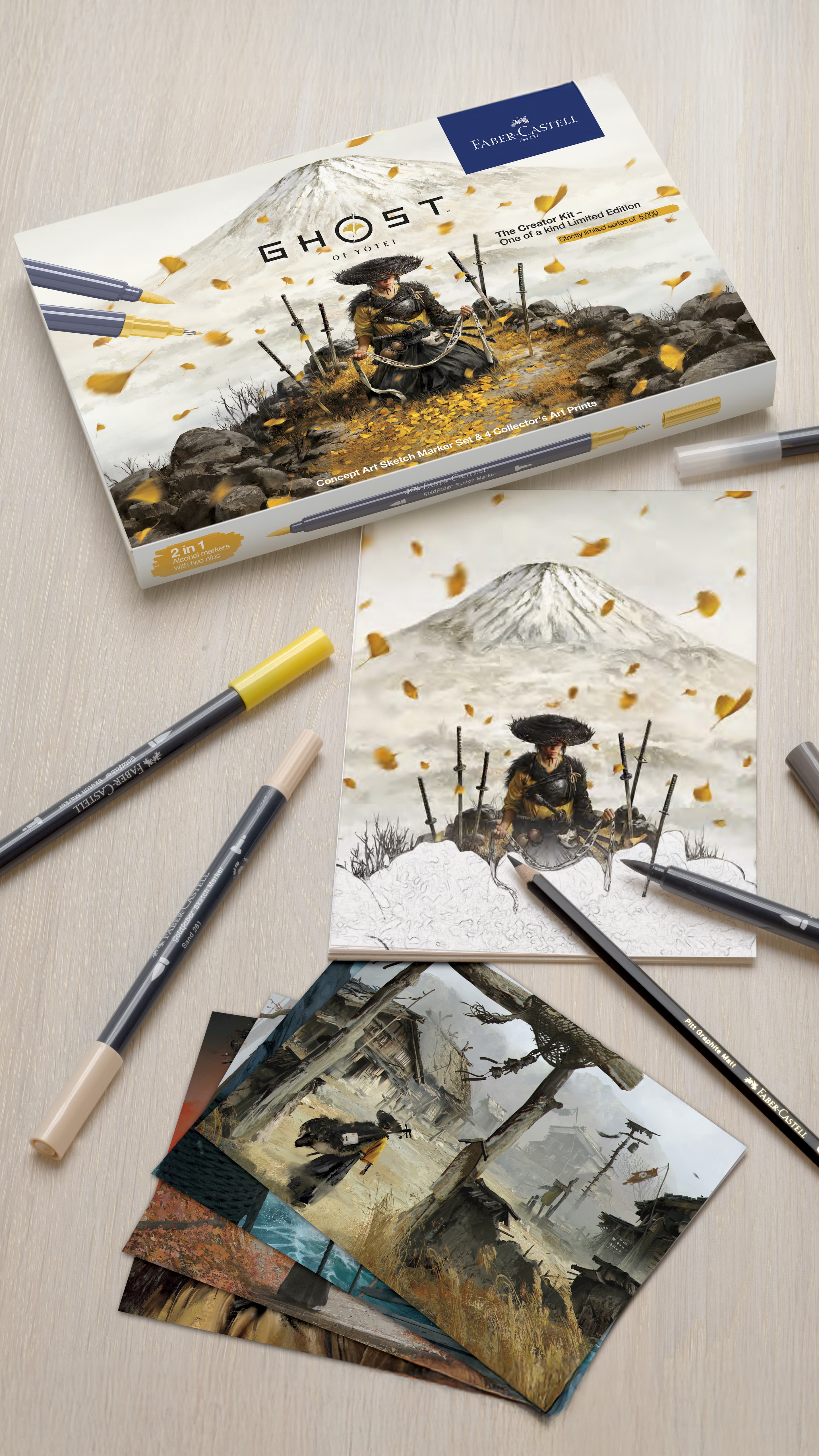 Das Creator Kit bringt dich direkt ins kreative Herz von Ghost of Yōtei. Es enthält vier Collector’s Art Prints der Ghost of Yōtei Artists, mit denen du dein Collectibles Display mit limitiertem Artwork um die Welt von Ghost of Yōtei erweitern kannst. Die sieben alkoholbasierten Goldfaber Sketch Marker sorgen mit ihrer schnelltrocknenden Tinte und zwei unterschiedlichen Spitzen (Fineliner- und Pinselspitze) für ein tolles Zeichenerlebnis. Ergänzt wird das Set durch den Goldfaber Sketch Colourless Blender, zwei Pitt Artist Pens, sowie einen Pitt Graphite Matt Bleistift für deine Skizzen und Layouts. Das Set gibt dir alle Tools in die Hand, um deine Ideen, Erlebnisse und Visionen zum Game und darüber hinaus aufs Papier zu bringen. Make the game your game. Create the world into your world.