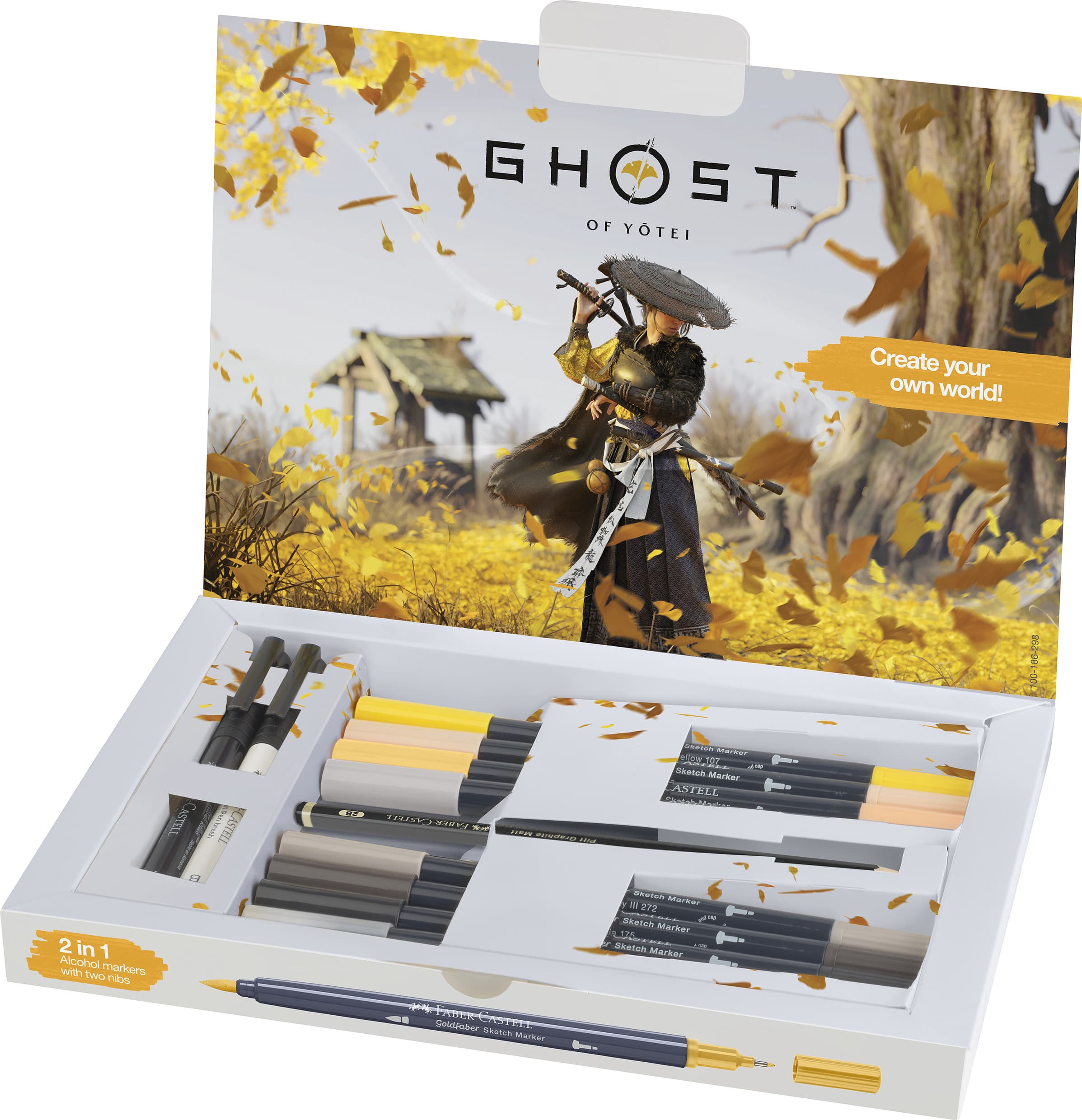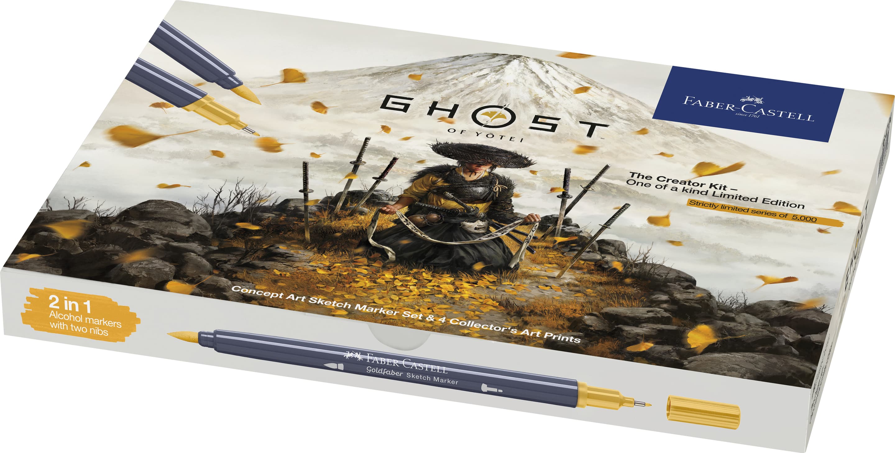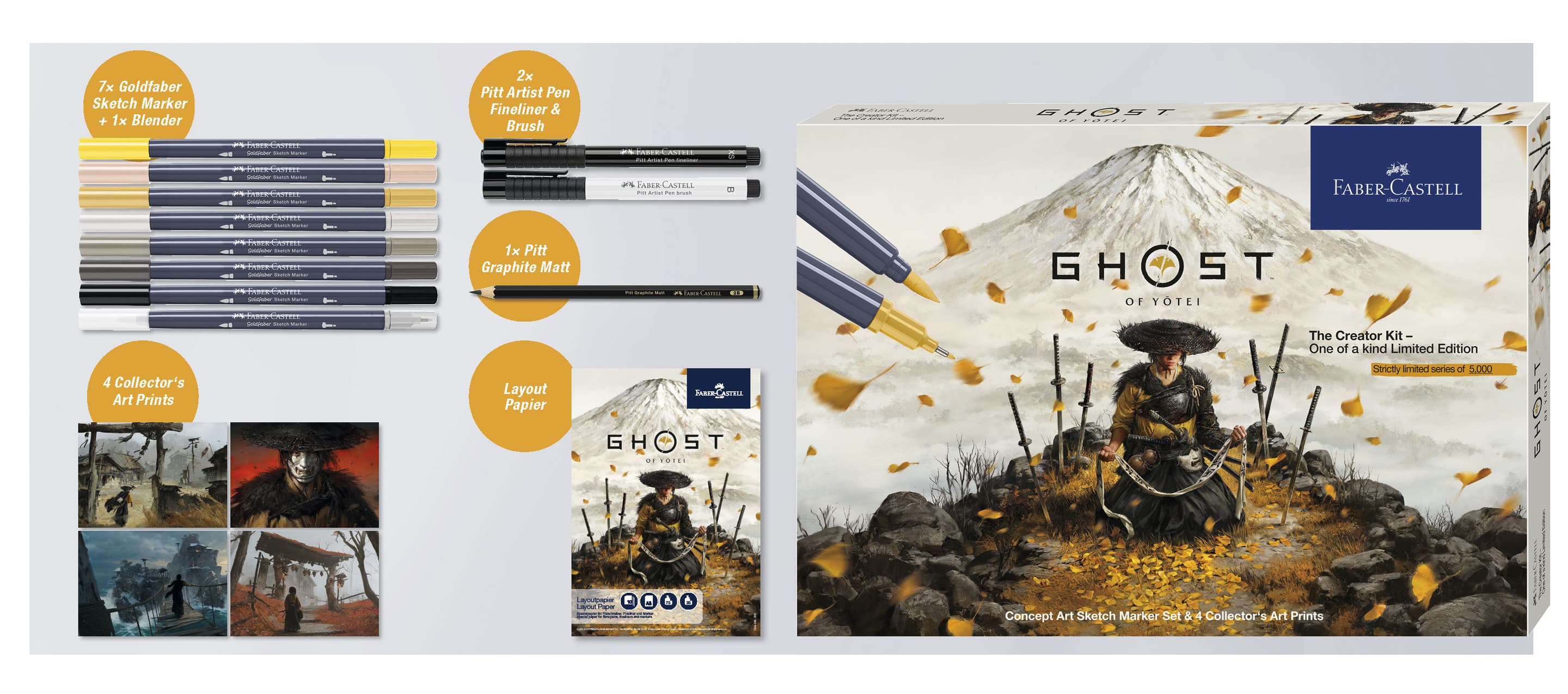 Das Creator Kit bringt dich direkt ins kreative Herz von Ghost of Yōtei. Es enthält vier Collector’s Art Prints der Ghost of Yōtei Artists, mit denen du dein Collectibles Display mit limitiertem Artwork um die Welt von Ghost of Yōtei erweitern kannst. Die sieben alkoholbasierten Goldfaber Sketch Marker sorgen mit ihrer schnelltrocknenden Tinte und zwei unterschiedlichen Spitzen (Fineliner- und Pinselspitze) für ein tolles Zeichenerlebnis. Ergänzt wird das Set durch den Goldfaber Sketch Colourless Blender, zwei Pitt Artist Pens, sowie einen Pitt Graphite Matt Bleistift für deine Skizzen und Layouts. Das Set gibt dir alle Tools in die Hand, um deine Ideen, Erlebnisse und Visionen zum Game und darüber hinaus aufs Papier zu bringen. Make the game your game. Create the world into your world.