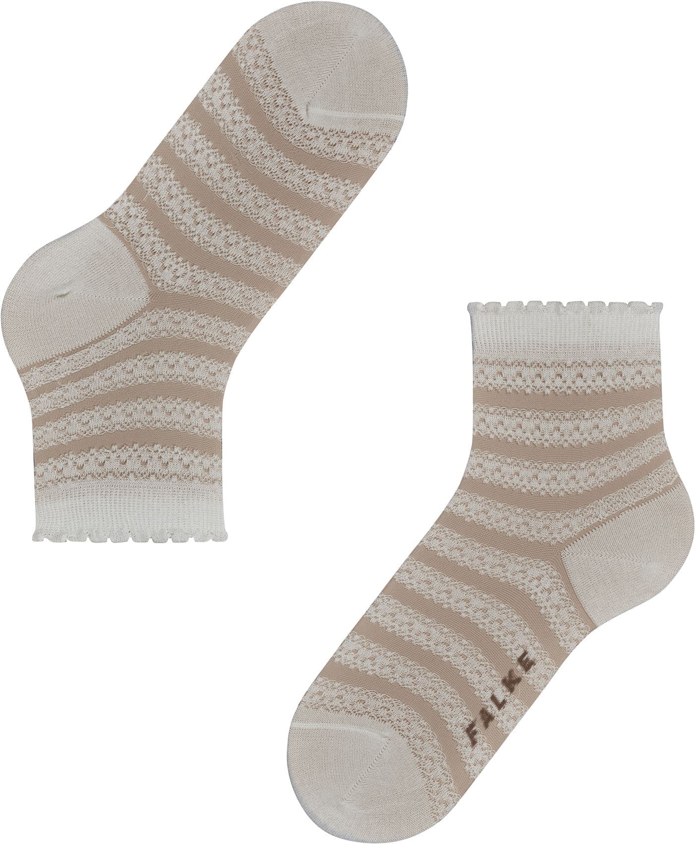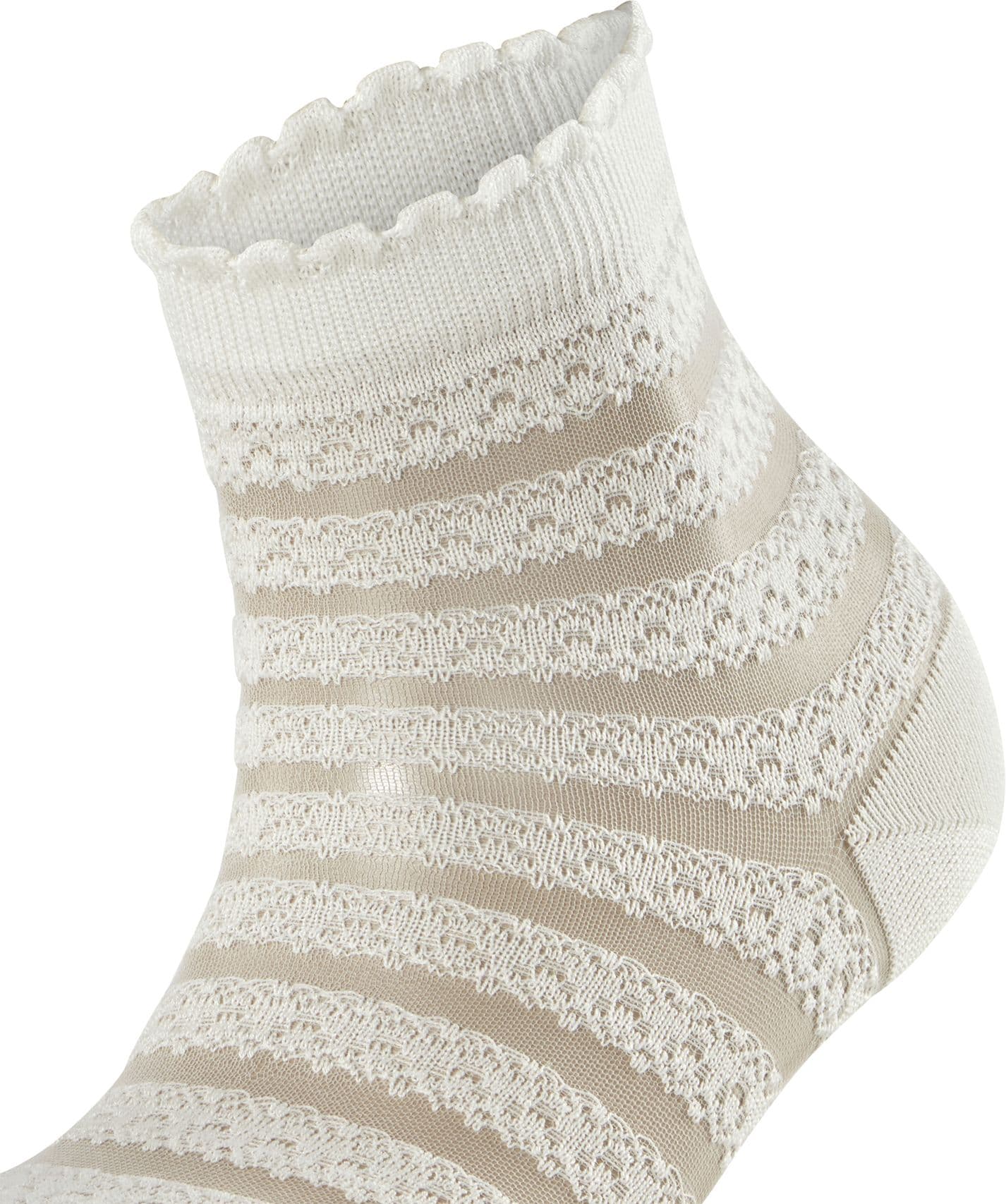 Dieser besonders feminine Kurzstrumpf überzeugt mit einem raffinierten Design, das traditionelle Spitze und Vintage-Häkelmuster auf moderne Weise vereint. Das transparente Allover-Streifenmuster interpretiert klassische Spitzenmotive neu und sorgt für einen romantischen Look. Das Highlight des Styles ist sein feminines Abschlussbündchen mit einer modernen Rüschen-Optik. Die Kombination aus hautfreundlicher, nachhaltiger Baumwolle gepaart mit Funktionsgarnen sowie der perfekten FALKE-Passform garantiert höchsten Tragekomfort. Sowohl zu Sneakern, als auch in Sandalen avanciert dieser Artikel zum absoluten Hingucker.
