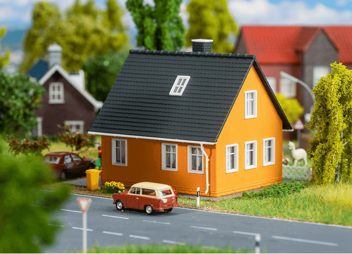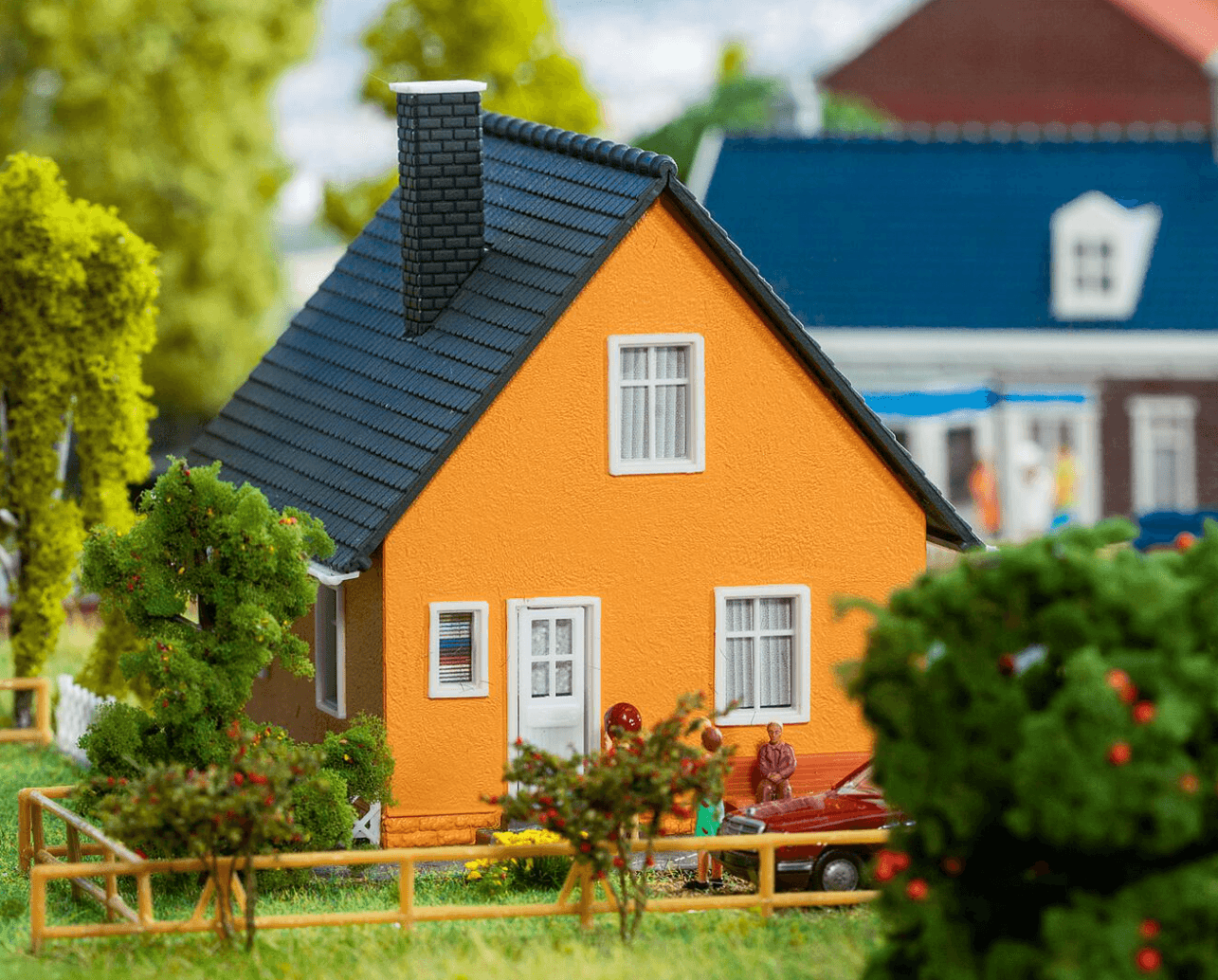 Das Siedlungshaus von FALLER ist ein typisches Einfamilienhaus im Maßstab H0 (1:87), das sich ideal in ländliche oder städtische Wohnsiedlungen Ihrer Modellbahnanlage einfügt. Mit seiner schlichten Architektur, dem Satteldach und den fein ausgearbeiteten Details wie Fensterrahmen und Eingangstreppe vermittelt das Modell ein realistisches Bild deutscher Wohnkultur der Nachkriegszeit.