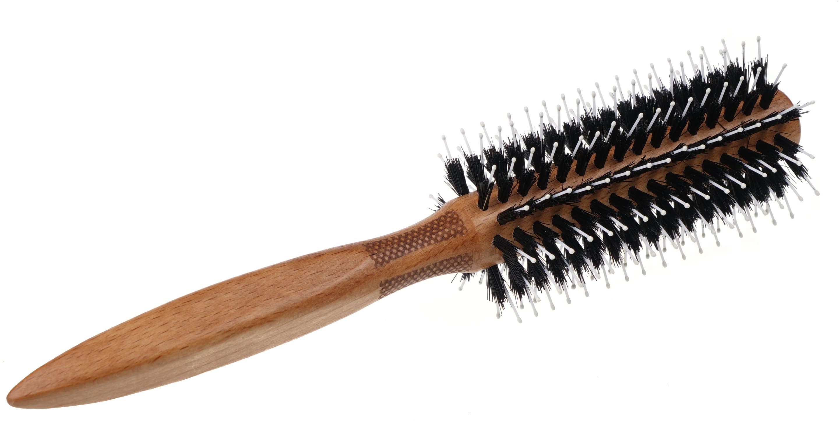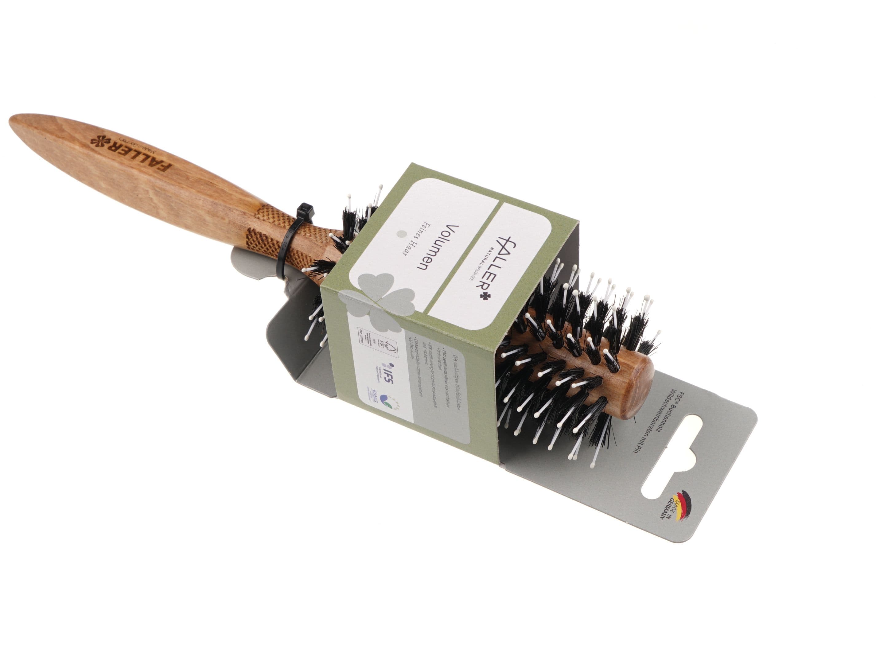 Volumen-Rundbürste aus gedämpftem Buchenholz mit reinen Wildschweinborsten und Pin für mehr Volumen und natürlichem Glanz.