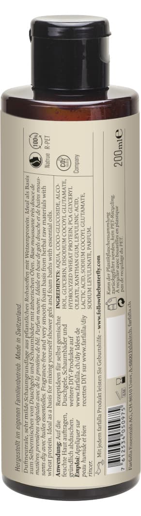 Duftneutrale, sehr milde Schaumgrundlage aus pflanzlichen Rohstoffen mit Weizenprotein. Ideal als Basis zum Selbermischen von Duschgels und Seifen mit ätherischen Ölen.