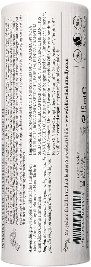 | Inhaltsstoffe | SIMMONDSIA CHINENSIS SEED OIL*, ARGANIA SPINOSA KERNEL OIL*, ROSA CANINA FRUIT OIL*, PARFUM (Natural Essential Oils), PUNICA GRANATUM SEED OIL*, BOSWELLIA CARTERII GUM OIL*, TOCOPHEROL, HELIANTHUS ANNUUS SEED OIL*, LIMONENE**, LINALOOL**, GERANIOL**,CITRAL**. * certified organic. **part of natural essential oils. |