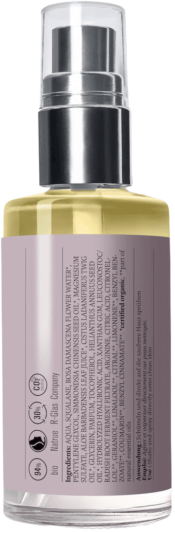 | Inhaltsstoffe | AQUA, SQUALANE, ROSA DAMASCENA FLOWER WATER*, PENTYLENE GLYCOL, SIMMONDSIA CHINENSIS SEED OIL*, MAGNESIUM SULFATE, ALOE BARBADENSIS LEAF JUICE*, CISTUS LADANIFERUS TWIG OIL*, GLYCERIN, PARFUM, TOCOPHEROL, HELIANTHUS ANNUUS SEED OIL*, HYDROLYZED HYALURONIC ACID, XANTHAN GUM, LEUCONOSTOC/RADISH ROOT FERMENT FILTRATE, ARGININE, CITRIC ACID, CITRONELLOL**, GERANIOL**, LINALOOL**, CITRAL**, LIMONENE**, BENZYL BENZOATE**, COUMARIN**. *certified organic. **part of natural essential oils. |
