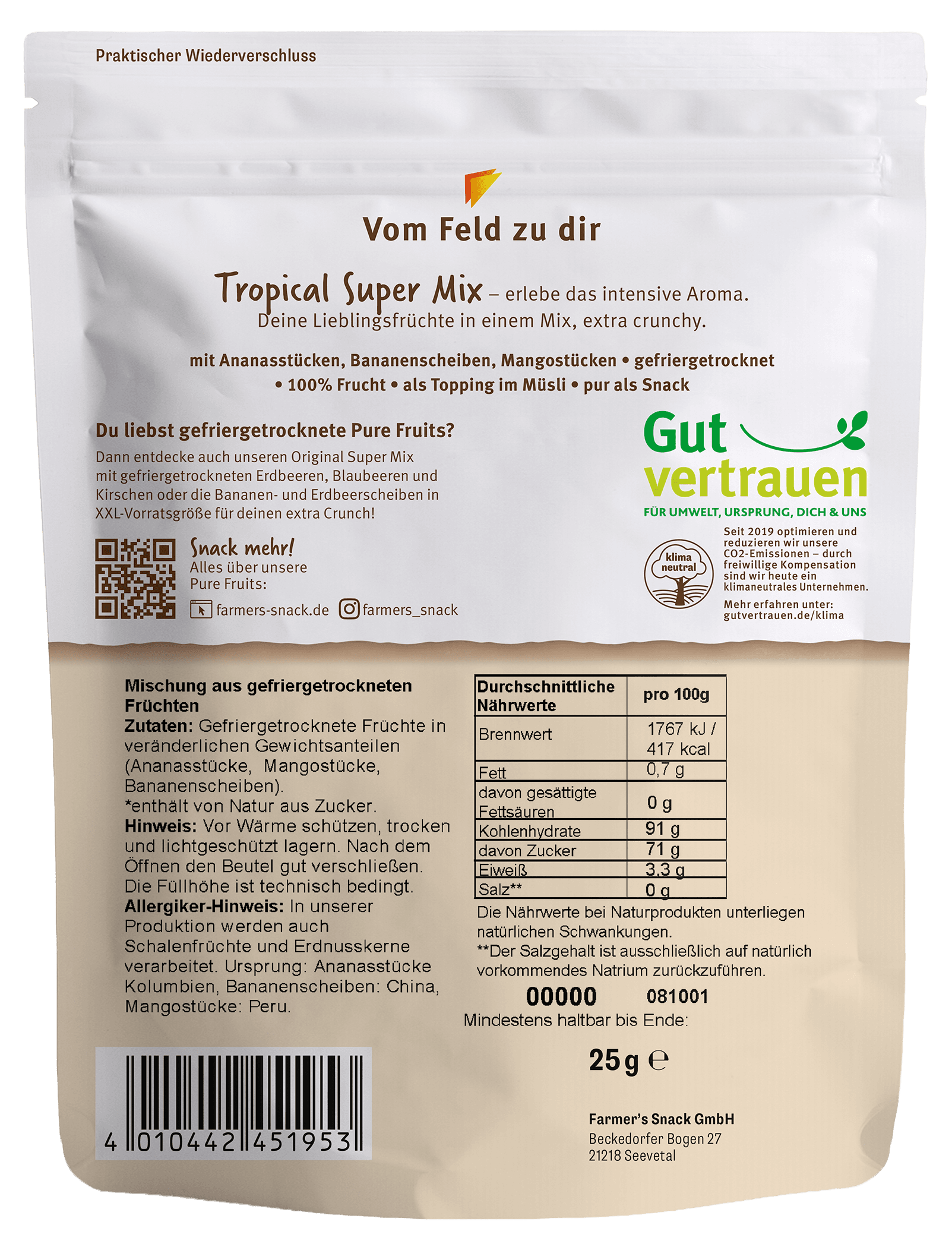 | Zutaten | Gefriergetrocknetes Früchte in veränderlichen Gewichtsanteilen (Ananasstücke, Mangostücke, Bananenscheiben). |
