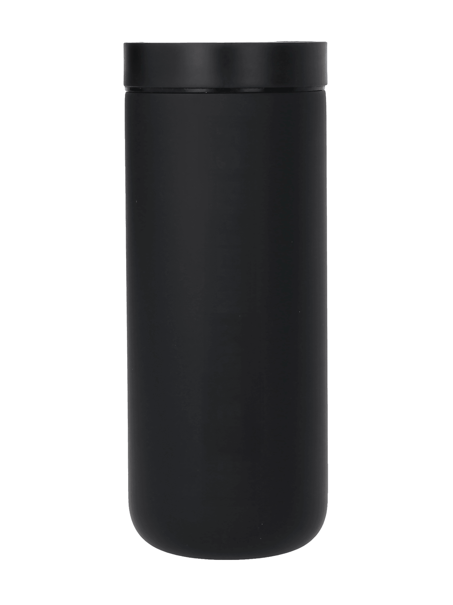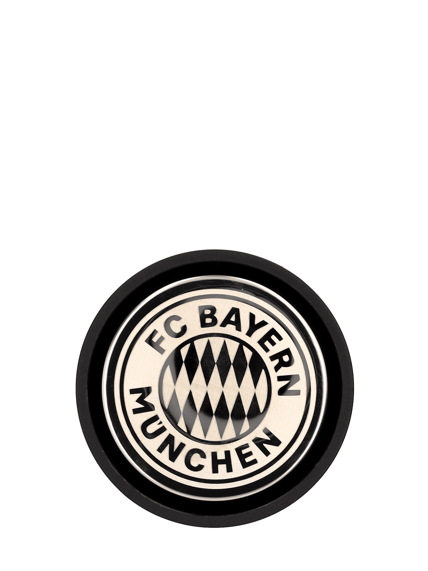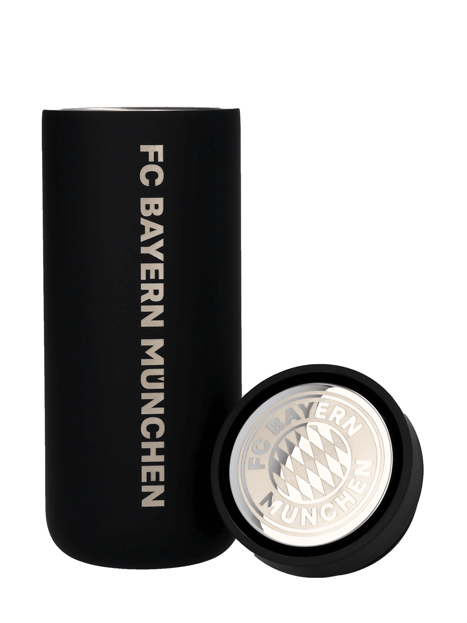 Schwarzer Thermobecher To Go mit silbernem FC Bayern München Logo auf dem Deckel.