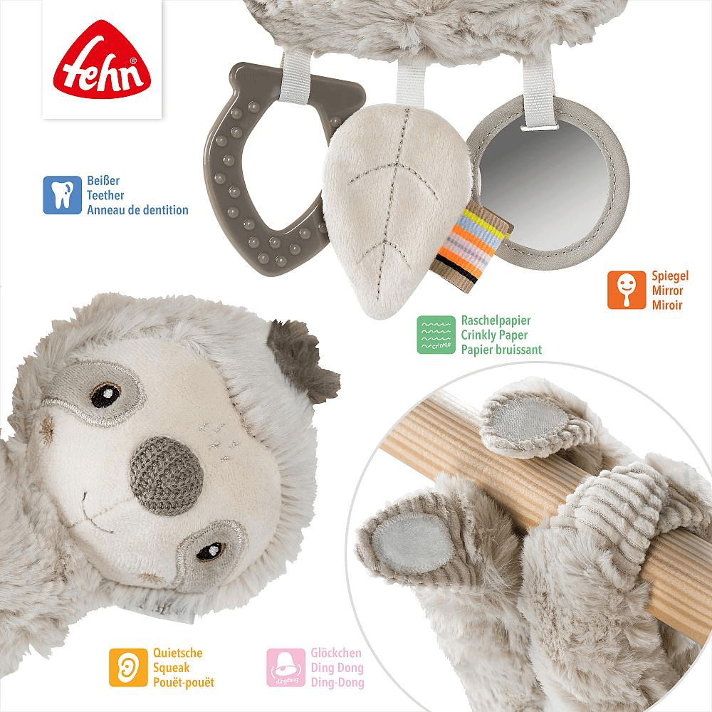 Das Faultier bietet spannende Details wie einen Spiegel, Rassel, Quietsche, Knisterpapier und einen Beißring – ideal zum Entdecken, Fühlen und Hören. Dank der praktischen Befestigung kann es einfach am Kinderwagen, an der Babyschale oder am Bettchen angebracht werden und ist somit auch unterwegs ein treuer Begleiter.