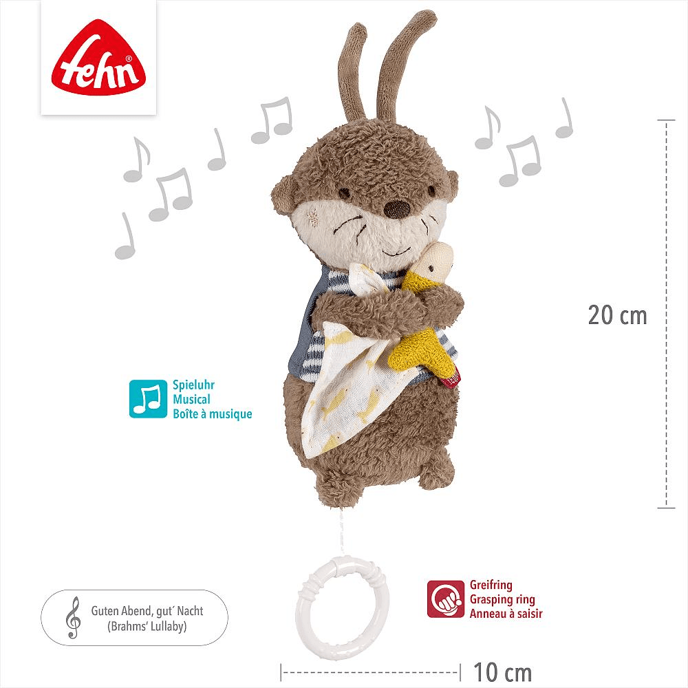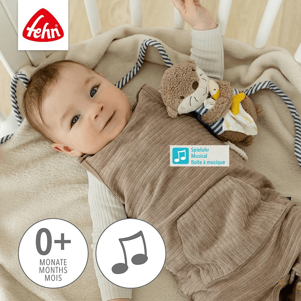 Die liebevoll gestaltete Mini-Spieluhr Otter aus der Otter Theo Kollektion von Fehn begleitet Babys sanft in den Schlaf. Mit ihrem kuschelweichen Stoff, den beruhigenden Farben und der zarten Melodie „Weißt du wieviel Sternlein stehen“ schafft sie eine entspannte Atmosphäre im Kinderzimmer oder unterwegs.