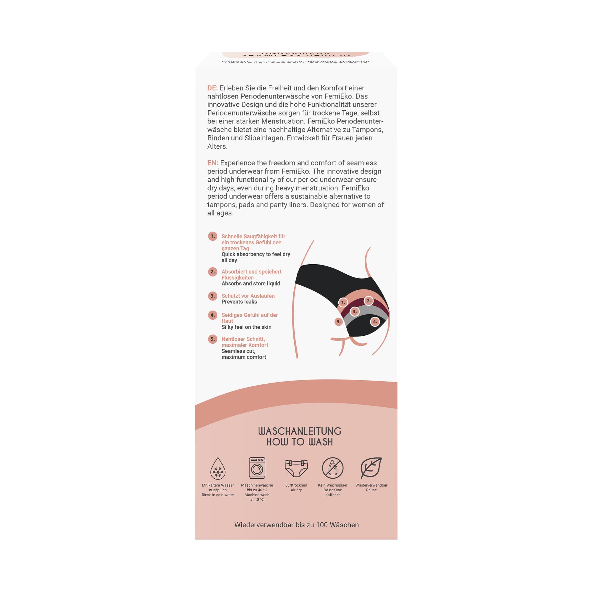 Entdecken Sie den ultimativen Schutz mit der hochsaugfähigen Menstruationsunterwäsche von Femi.Eko! Ideal für die Nacht ersetzt sie die Saugfähigkeit von bis zu 5 Tampons. Unsere Unterwäsche zeichnet sich durch einen erweiterten Schutz aus: die absorbierenden Schichten erstrecken sich bis zur Taille, gewährleisten somit einen umfassenden Schutz und Sicherheit während des gesamten Menstruationszyklus. Genießen Sie nahtlosen Komfort: Die Menstruationsunterwäsche von Femi.Eko sind ohne Nähte gestaltet, um Ihnen sowohl tagsüber als auch nachts ein angenehmes und bequemes Gefühl zu bieten. Wir setzen auf Nachhaltigkeit: Unsere Unterwäsche kann einfach gewaschen und wiederverwendet werden - schont die Umwelt !