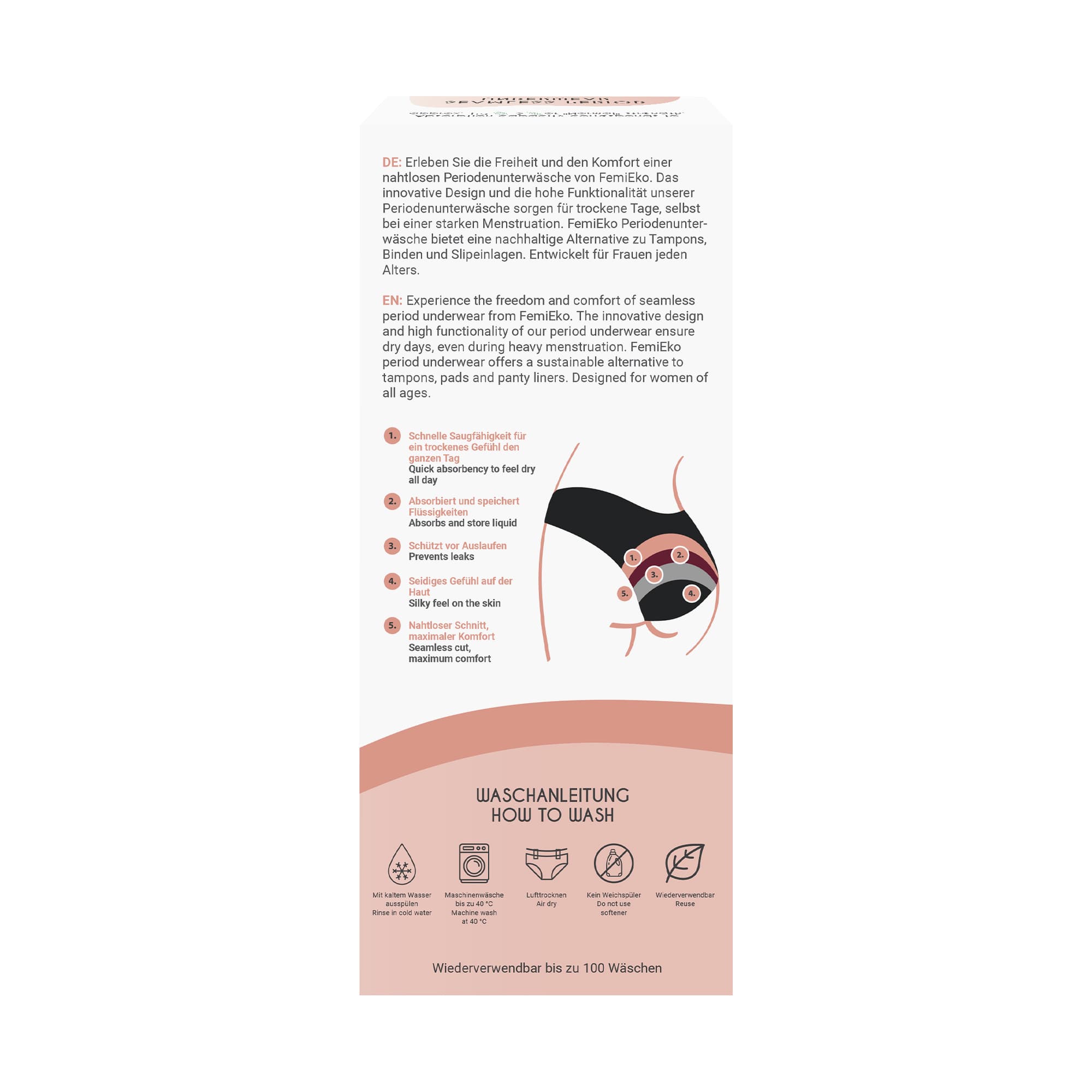 PflegehinweisVorabreinigung: Nach jeder Verwendung und vor der ersten Anwendung waschen Sie die Menstruationsunterwäsche entweder von Hand oder in der Waschmaschine bei maximal 40 Grad Celsius. Nach jedem Gebrauch spülen Sie die Unterwäsche in kaltem Wasser aus, bevor Sie sie waschen. Verwenden Sie einen Wäschesack, um die Nähte zu schützen.Reinigungsanleitung: Verwenden Sie keine chemischen Reinigungsmittel, Chlor, Weichspüler oder Parfüm. Bügeln Sie die Unterwäsche nicht und trocknen Sie sie nicht im Trockner oder auf dem Heizkörper.Sorgen Sie dafür, dass Ihre Menstruationsunterwäsche vor der Lagerung vollständig trocken ist, um die Bildung von Bakterien durch Feuchtigkeit zu vermeiden.Lagerung: Lagern Sie Ihre Menstruationsunterwäsche an einem sauberen, trockenen Ort, fernab von Feuchtigkeit und direktem Sonnenlicht, um ihre Qualität zu bewahren.Tragezeit: Begrenzen Sie die Tragedauer der Unterwäsche auf maximal 12 Stunden hintereinander für optimale Hygiene und Komfort.