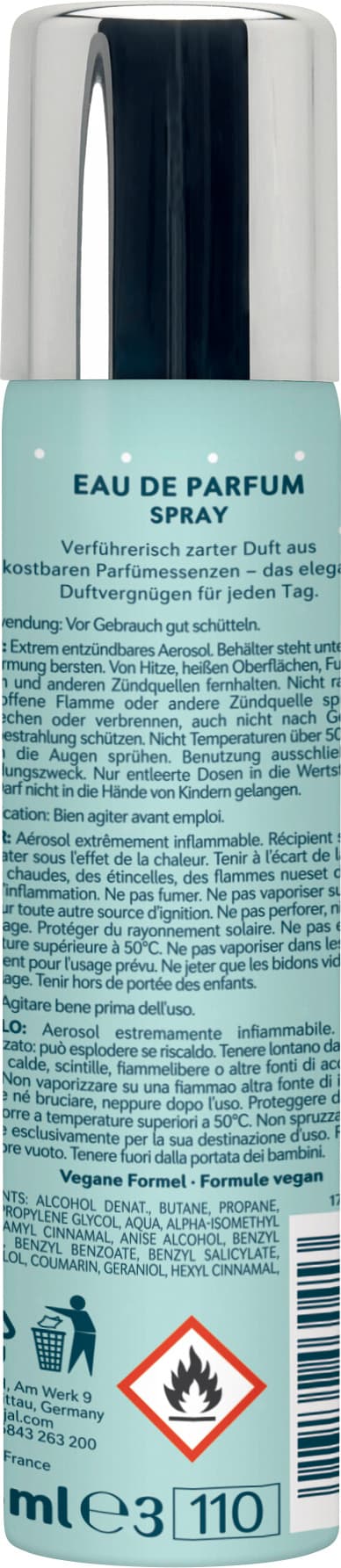 | Inhaltsstoffe | ALCOHOL DENAT., BUTANE, PROPANE, PARFUM, PROPYLENE GLYCOL, AQUA, ALPHA-ISOMETHYL IONONE, AMYL CINNAMAL, ANISE ALCOHOL, BENZYL ALCOHOL, BENZYL BENZOATE, BENZYL SALICYLATE, CITRONELLOL, COUMARIN, GERANIOL, HEXYL CINNAMAL, LINALOOL |