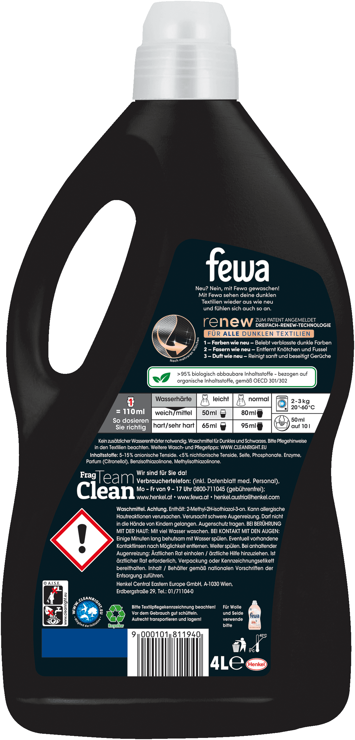 Mit Fewa Black sehen deine dunklen Textilien wieder aus wie neu und fühlen sich auch so an. Fewa überzeugt mit der zum Patent angemeldeten Dreifach-Renew-Technologie, geeignet für alle dunklen Textilien.